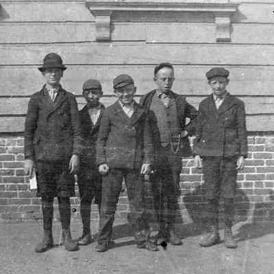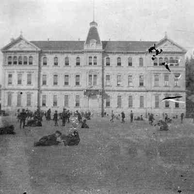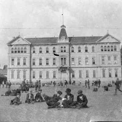 Negative strip containing 4 photos each about 2.25 square. Shows people outside a school.
