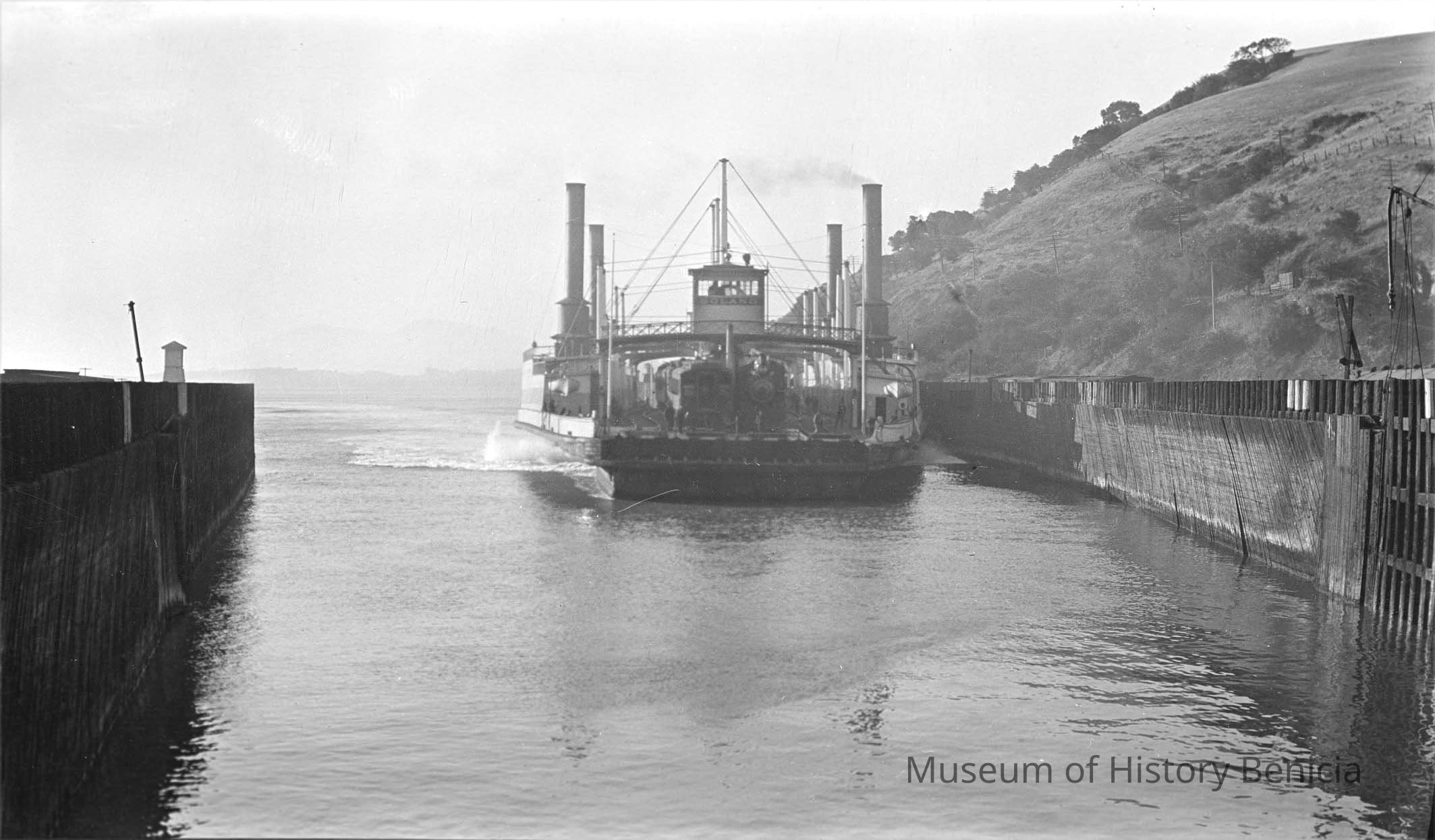 Negative of ferry boat Solano coming into dock in Port Costa.