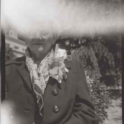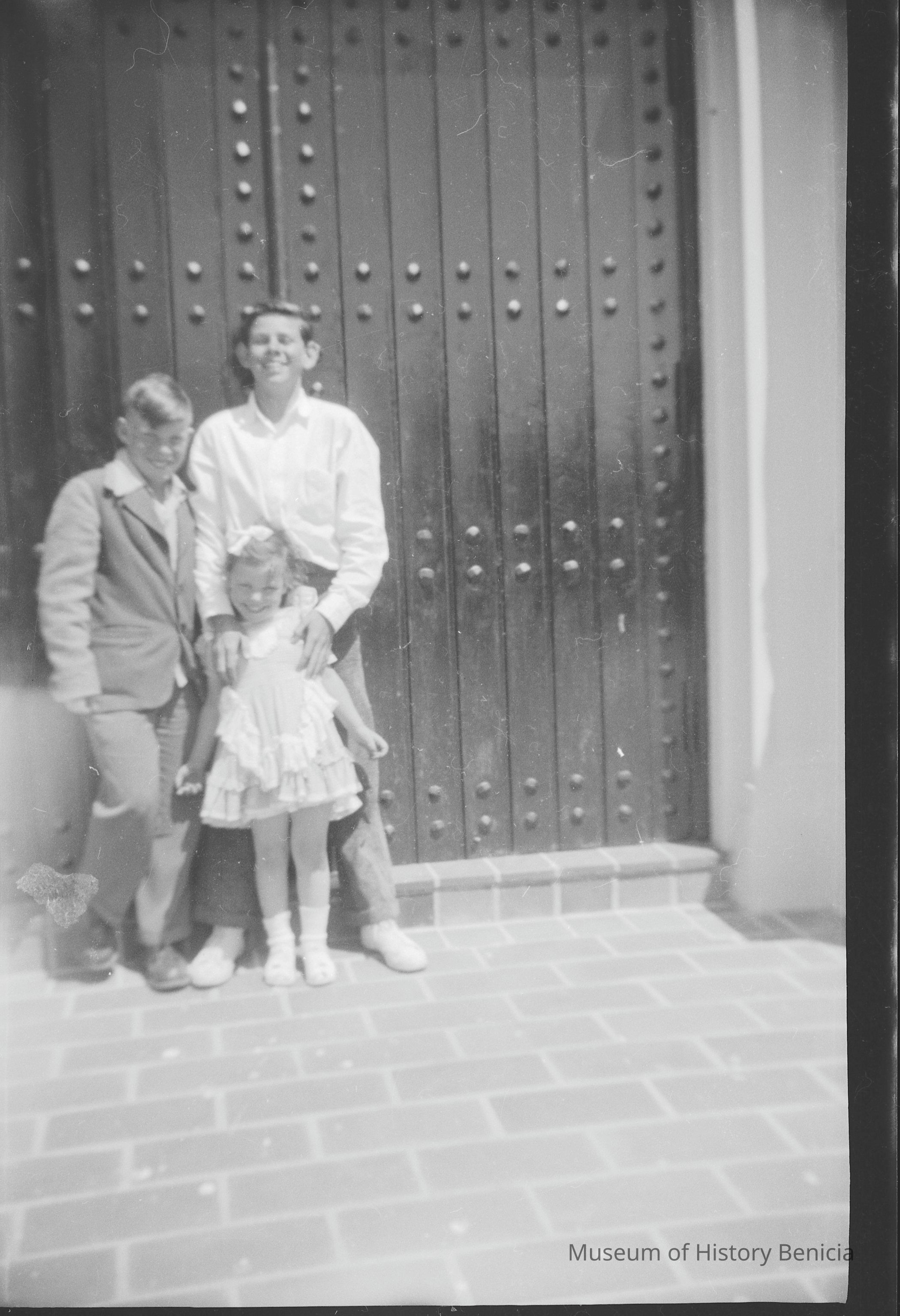 This is two photos on a single strip negative. One image is of two boys and a girl in front of church doors. The other is of a woman with a large corsage.Collection