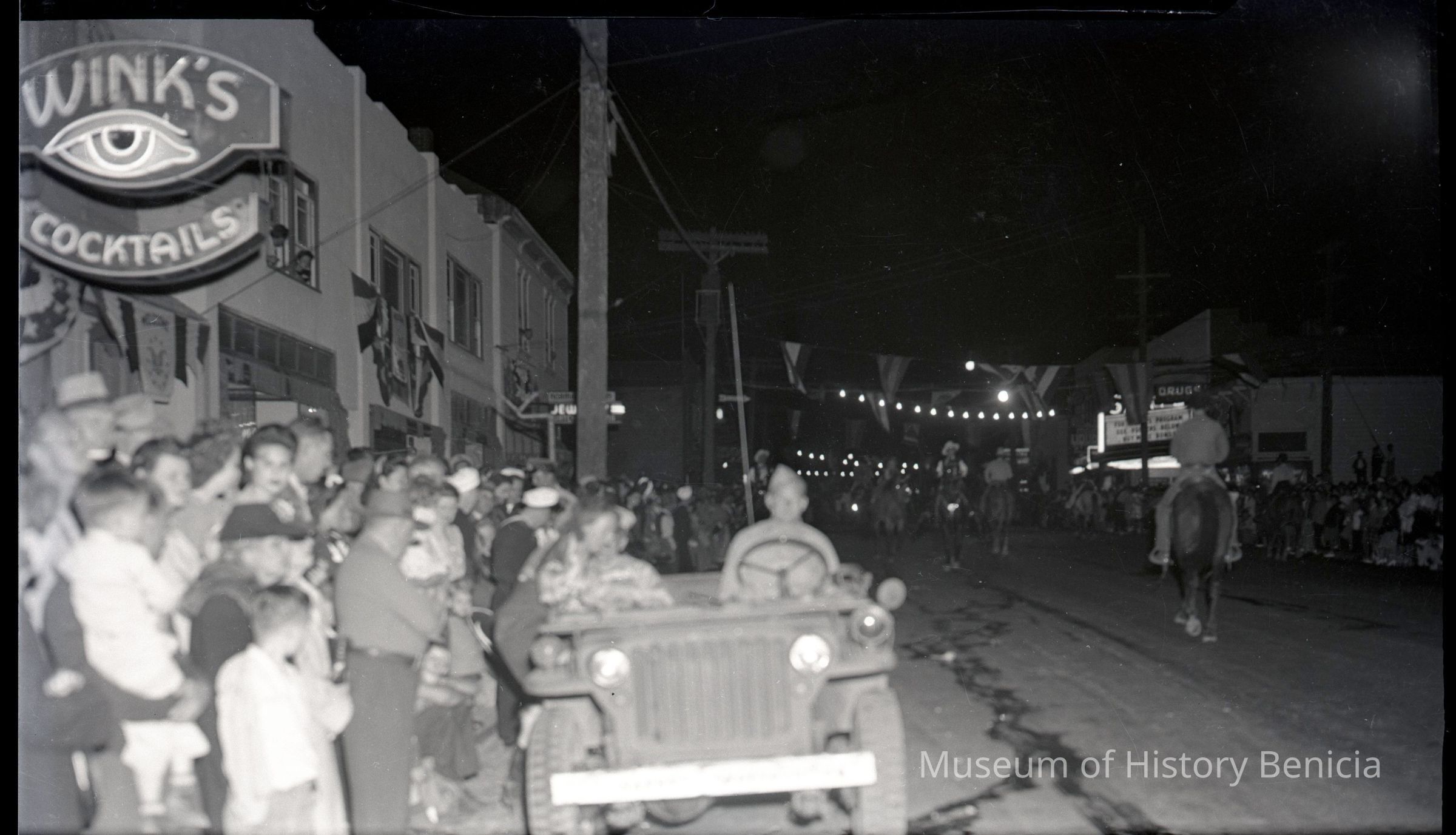 The parade was at night and the photo is taken in front of Wink's bar. In the background is a drug store and a theater. An Army jeep is pared next to the onlookers.Collection