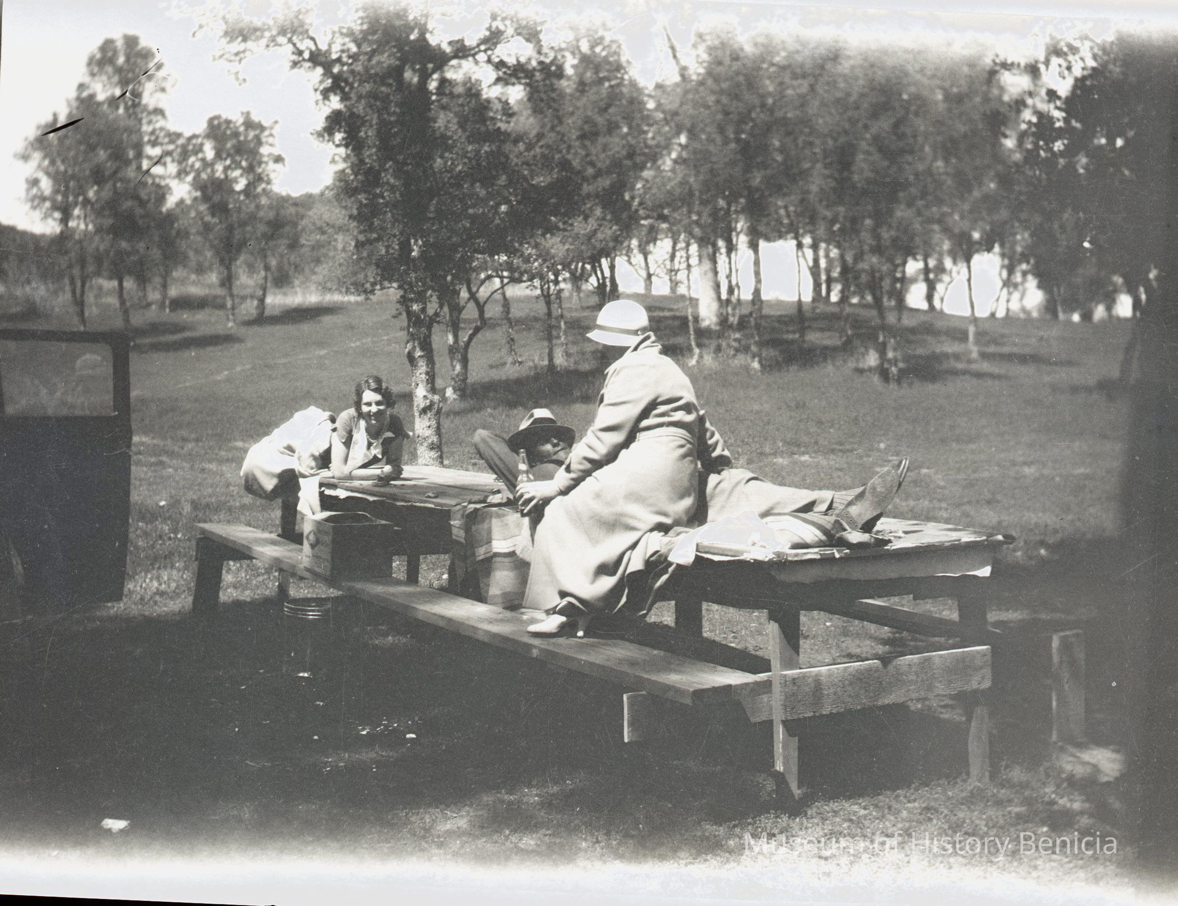 This is negative of several people having a picnic in a park. The park does not look like Benicia's downtown park.