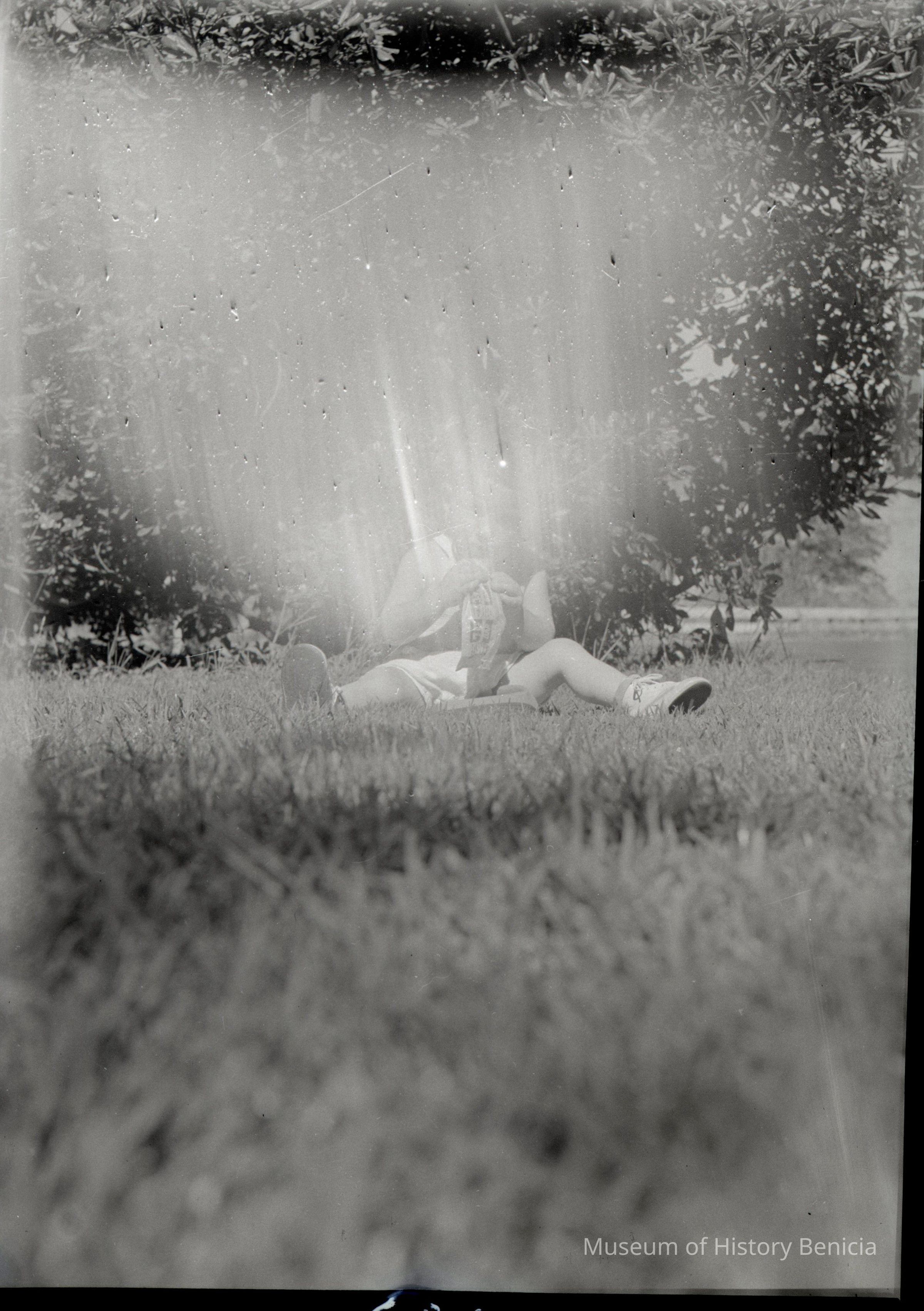 This is negative of a girl sitting on the grass. There is a large flare in the middle the obscures most of the photo.