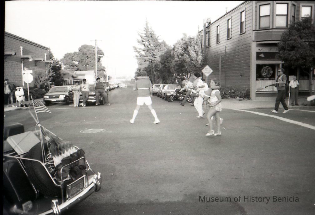 This is a photo of downtown Benicia during a parade. It shows people with life jackets.
