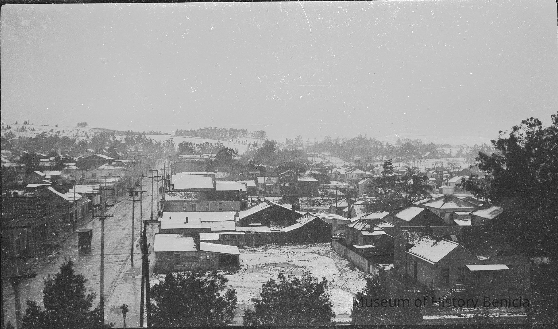 B/W negative. Mostly of the Ferry Boat Solano. This is a view of Benicia covered in snow.