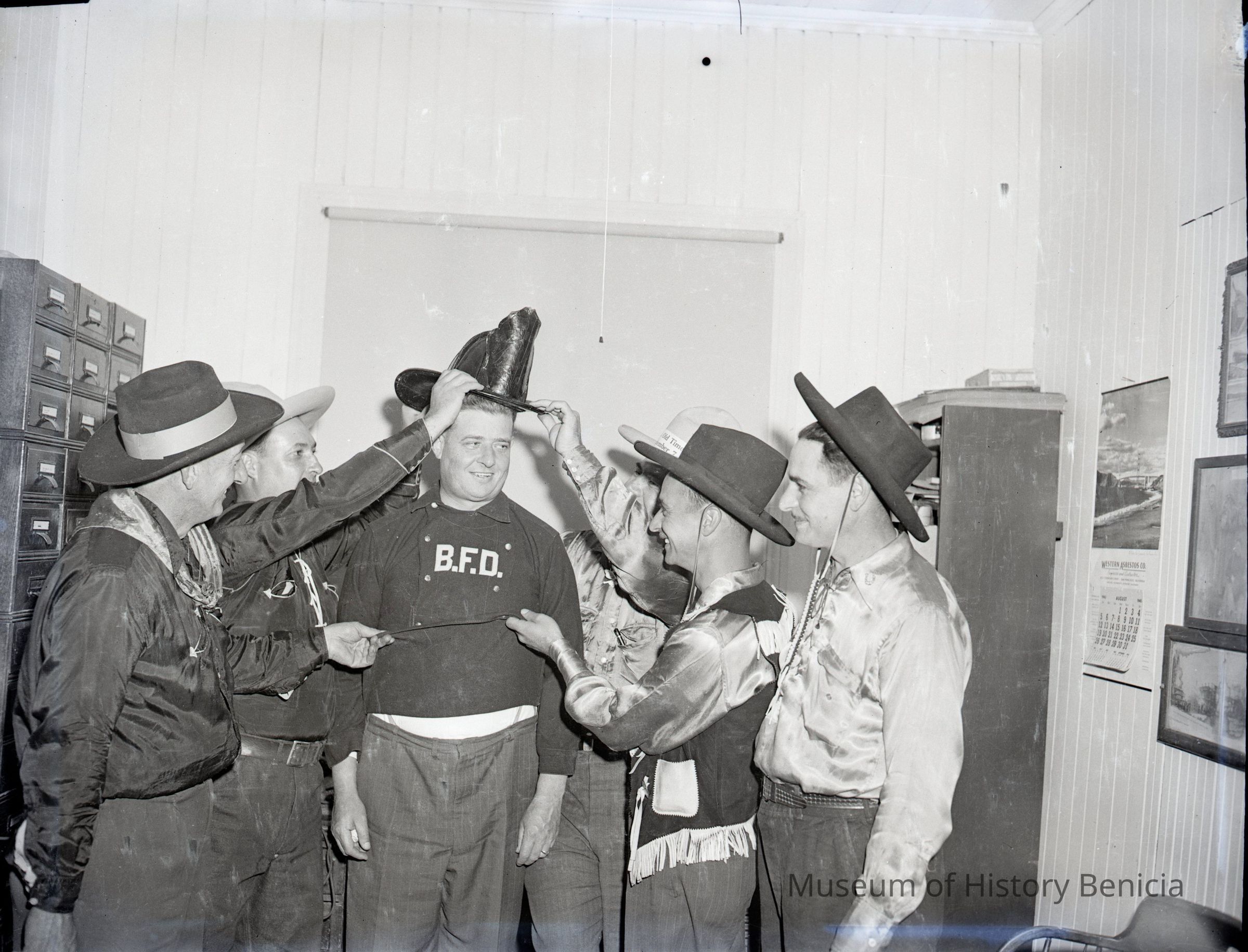 (1) Steve DeBenedetti, Mare Island employee (far right). (2) John Alves (3) Joaquin Gonsalves (4) center man--unknown (5) and (6) unidentified. Old Timers Day celebration (see hat band). Black and white photo.