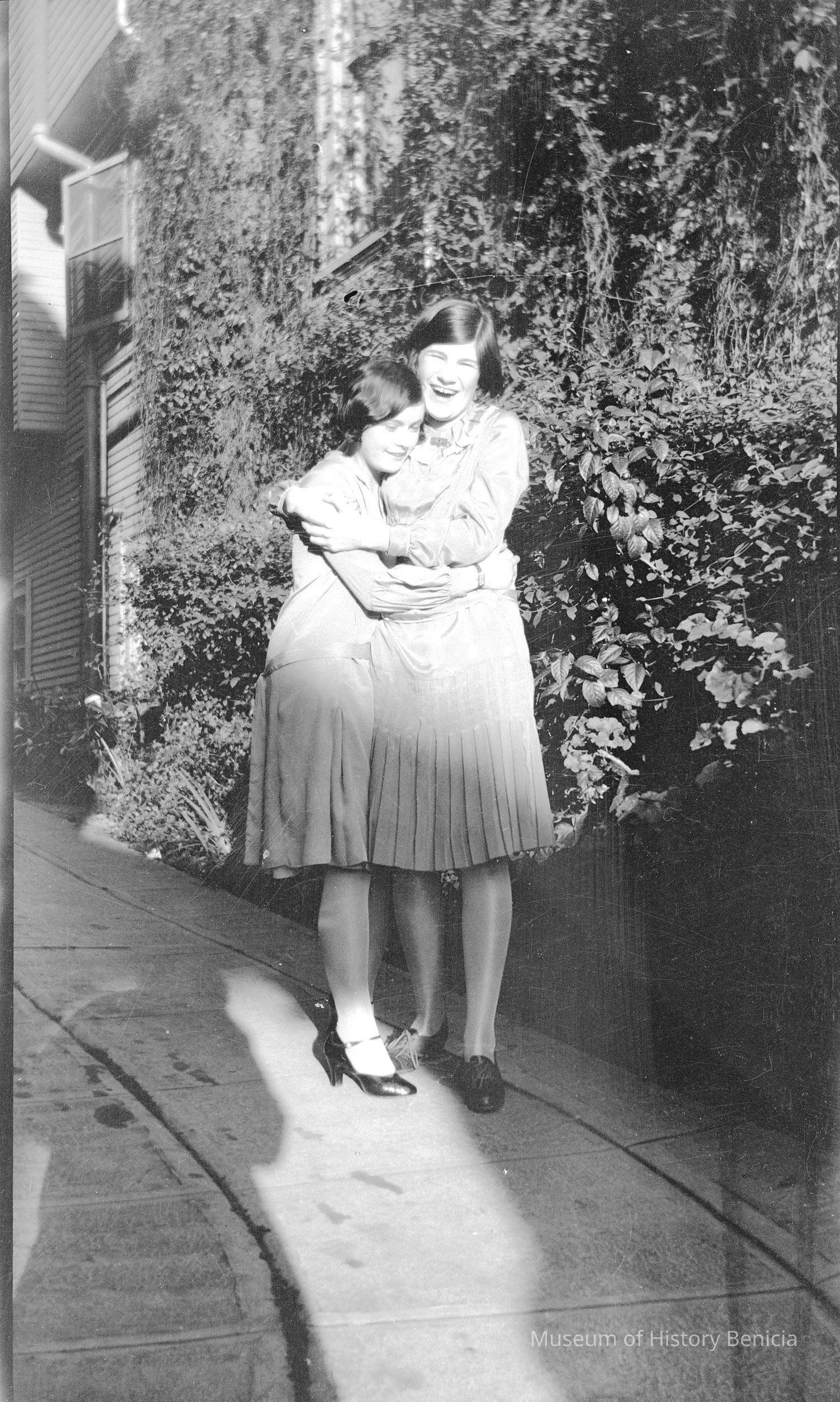 Negative of a two girls on the sidewalk.
