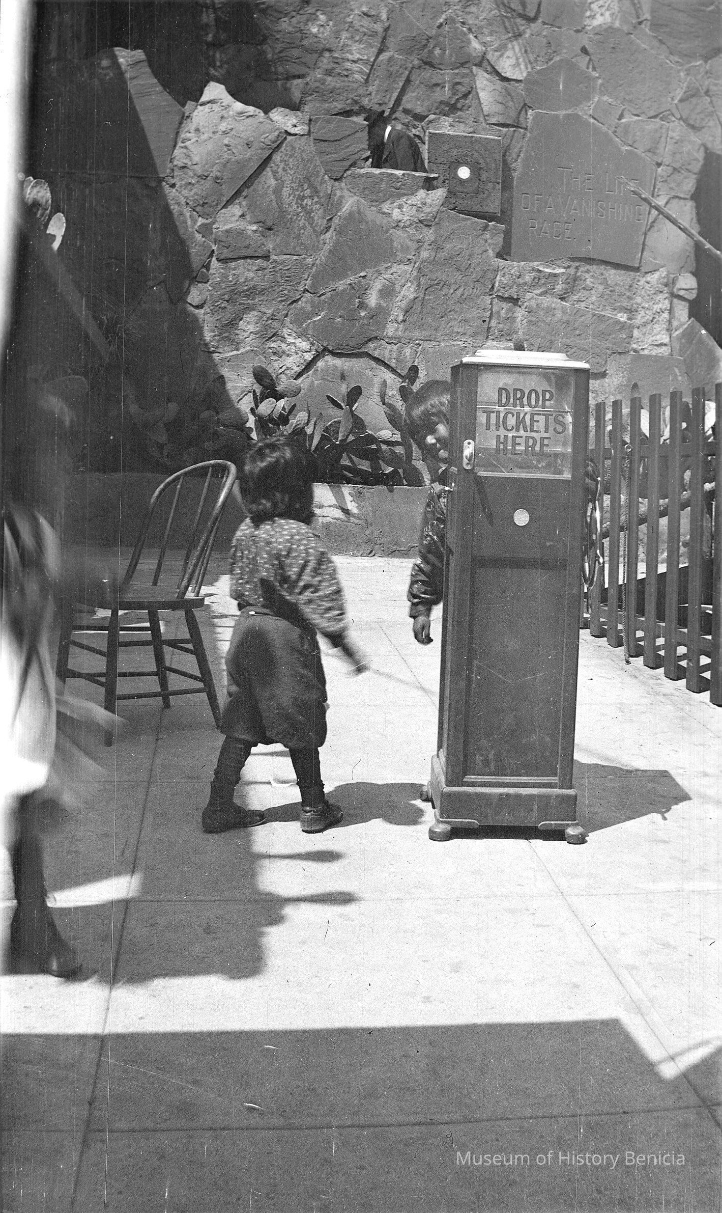 Negative of two oriental kids next to ticket box at Panama Pacific International Exhibition of 1915 in San francisco in the Native American hall.Collection