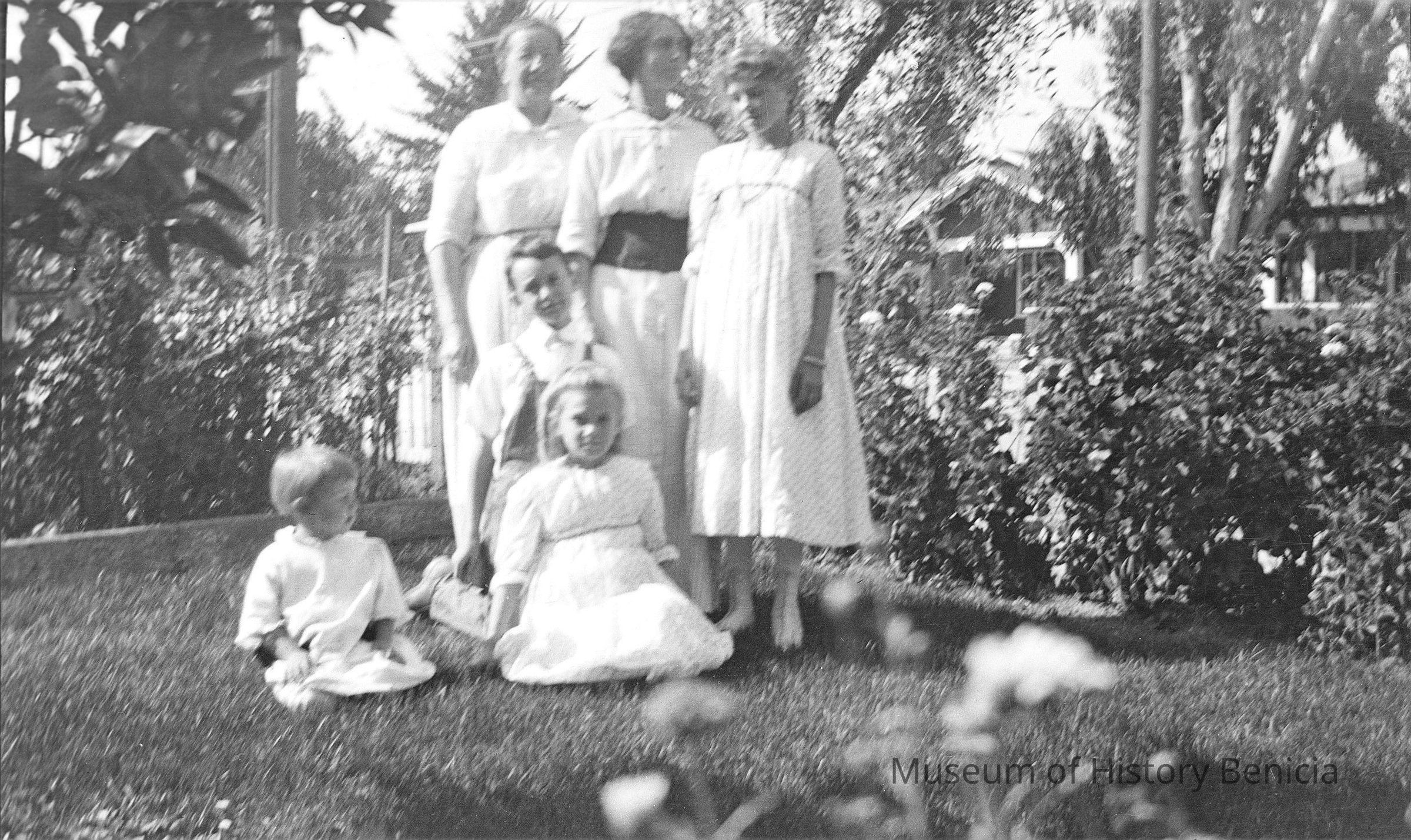 Negative of people in a garden. The small girl on the grass is Violet Molfino and the standing girl is Marguerite Molfino. The "boy" in the overalls may be the girl the Molfino family called "Jac" whose real name was Marguerite xxxxxxx.Collection