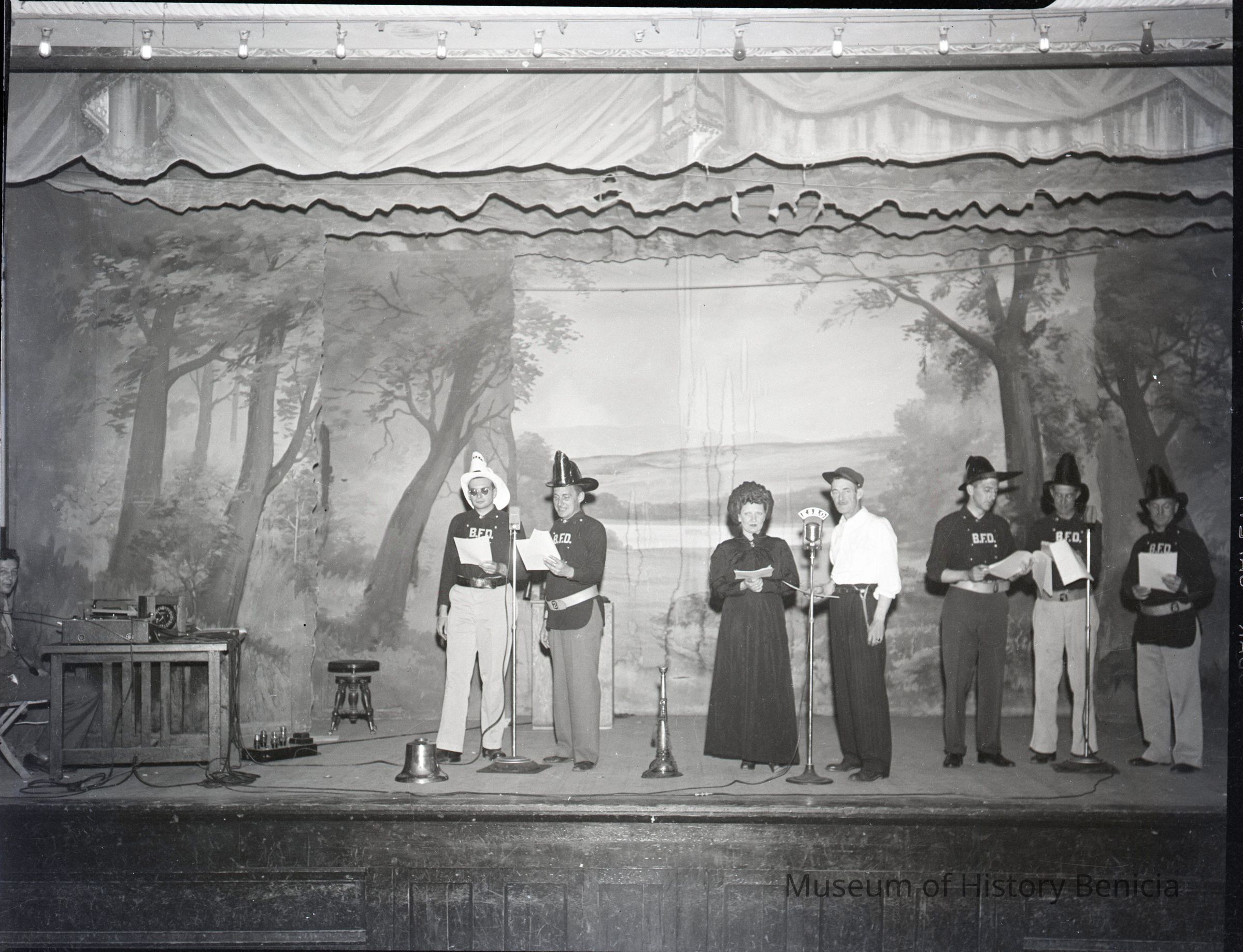 Photo of an Old Timers Celebration doin a radio show. Probably 1947 or 1945. One of the photos in this group shows a boy standing in front of a sign for the 1945 Old Timers Celebration.Collection