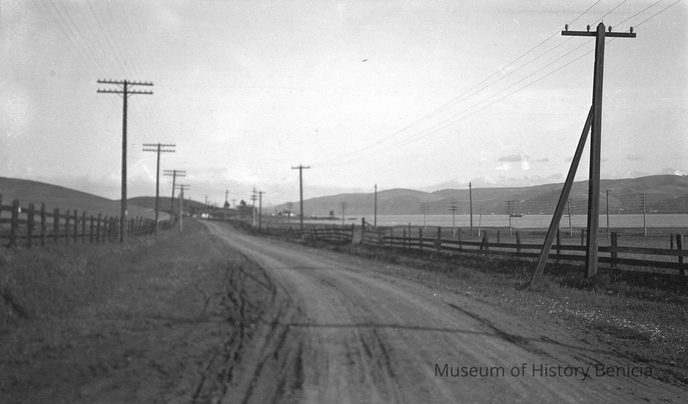 Street scenes Benicia. Road near Carquinez Straits with telephone poles along the side.