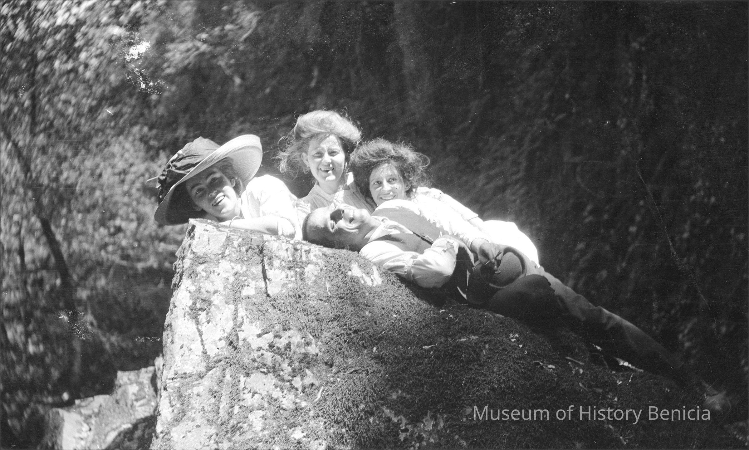 Four people laying on a rock..