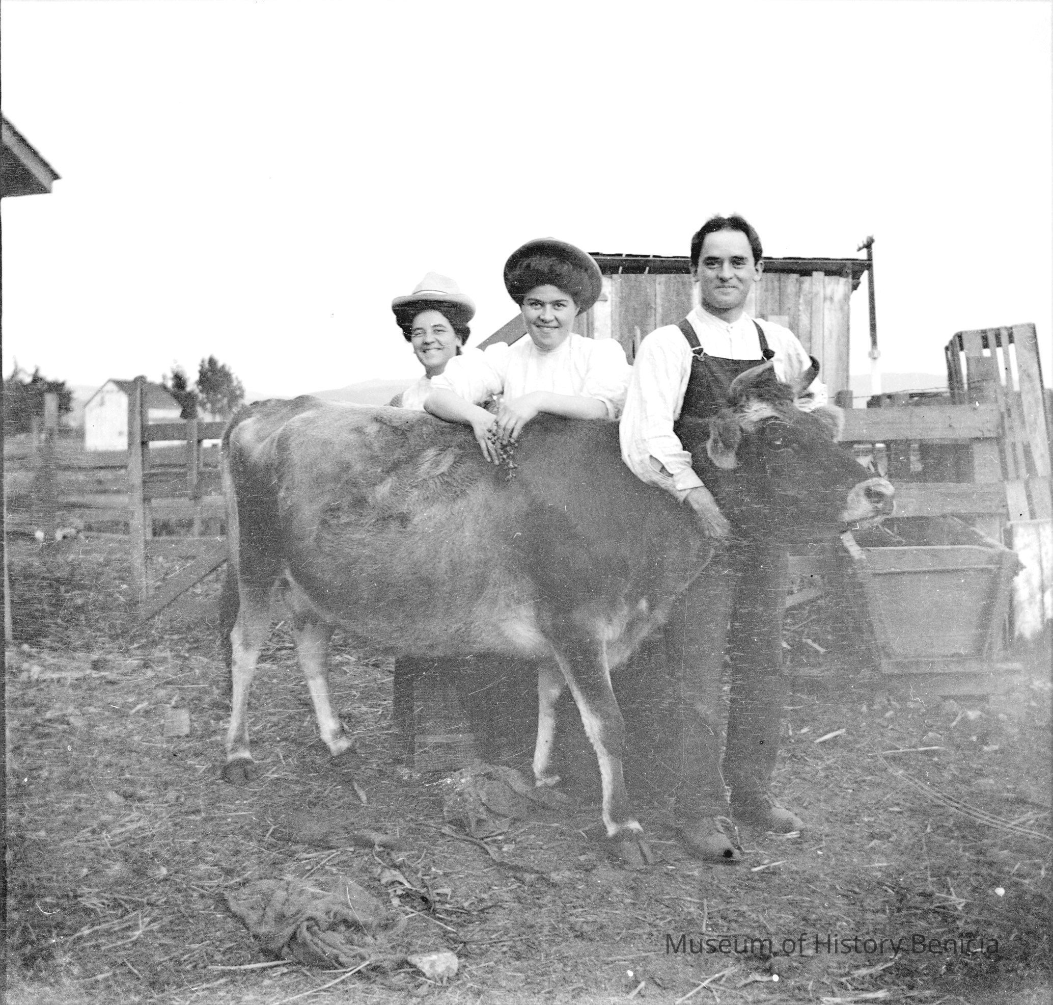 Negative of two women and a man with a cow.. In an envelope with "of Molfino" scratched out and "Manez" written on the front.
