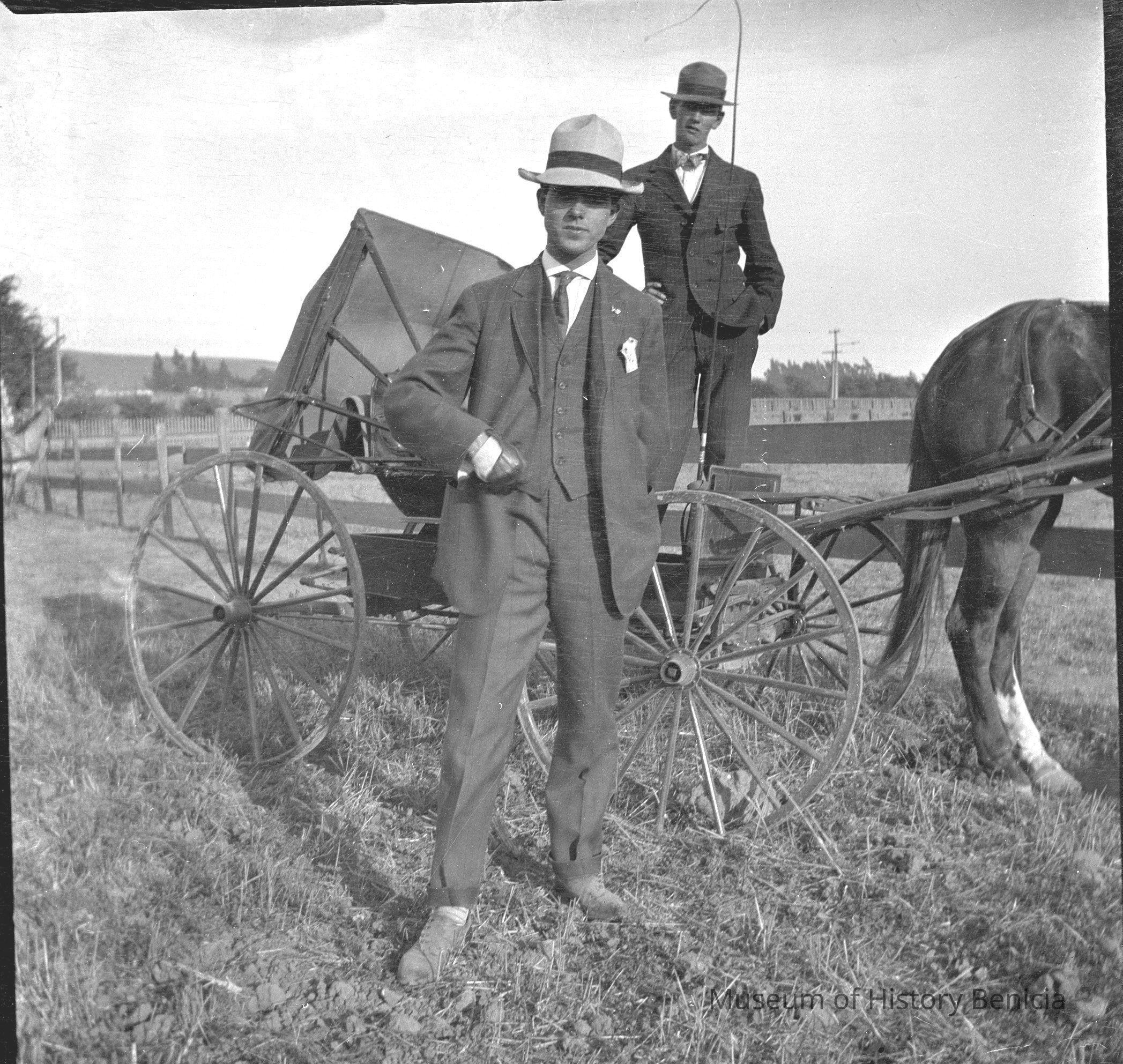 Negative of a two men in suits next to a buggy. In an envelope with "of Molfino" scratched out and "Manez" written on the front.