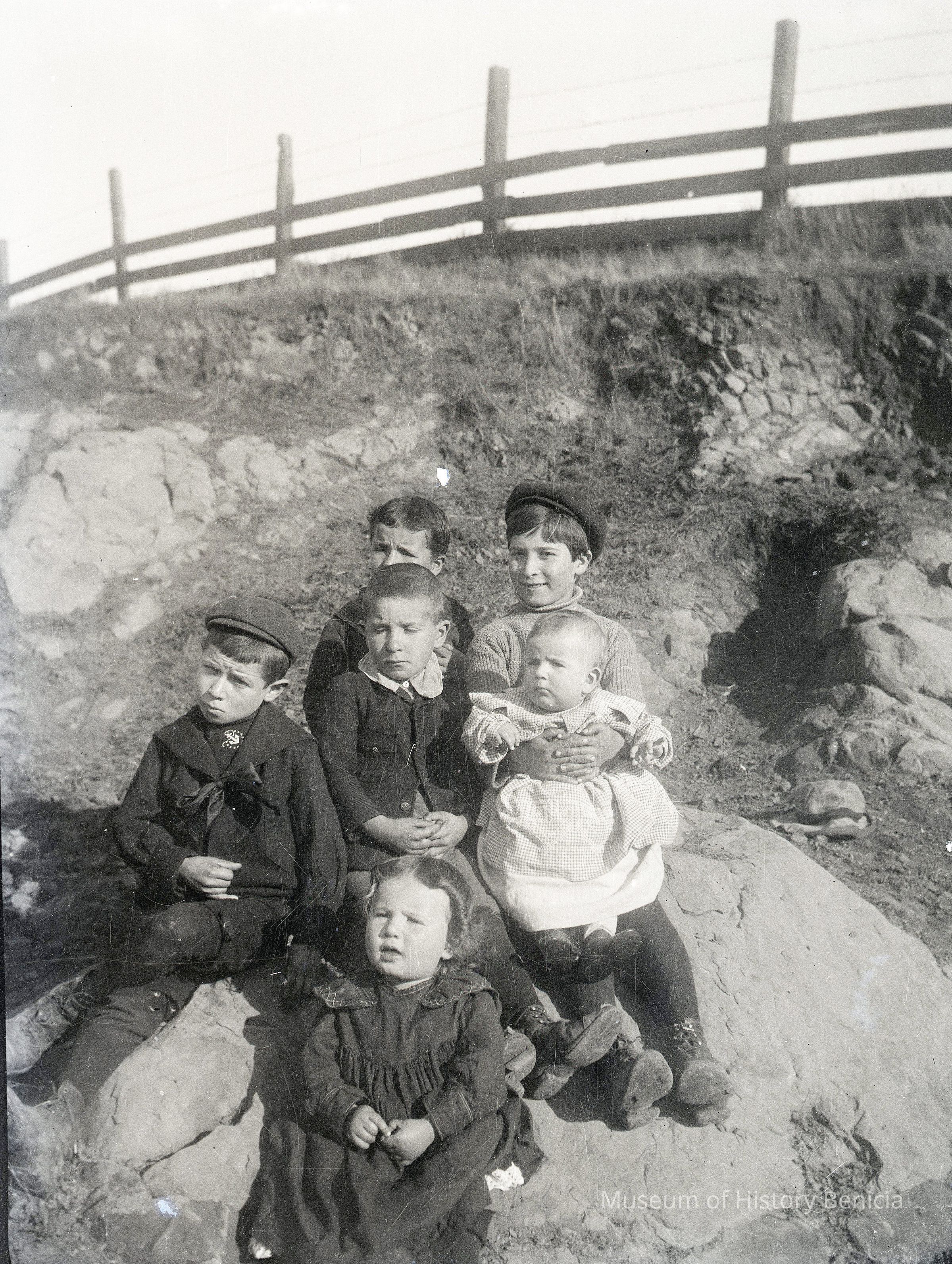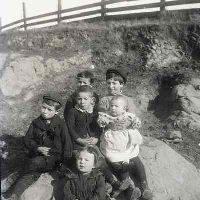 B/W Negative: appears to be an unidentified woman and five children sitting on a rock; the woman in holding one of the chidren on her lap; there is a fence in the backgroundCollection
