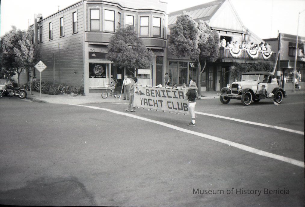 This is a photo of downtown Benicia during a parade. The entry shown is for the Benicia Yacht Club and is followed by a vitage car.Collection