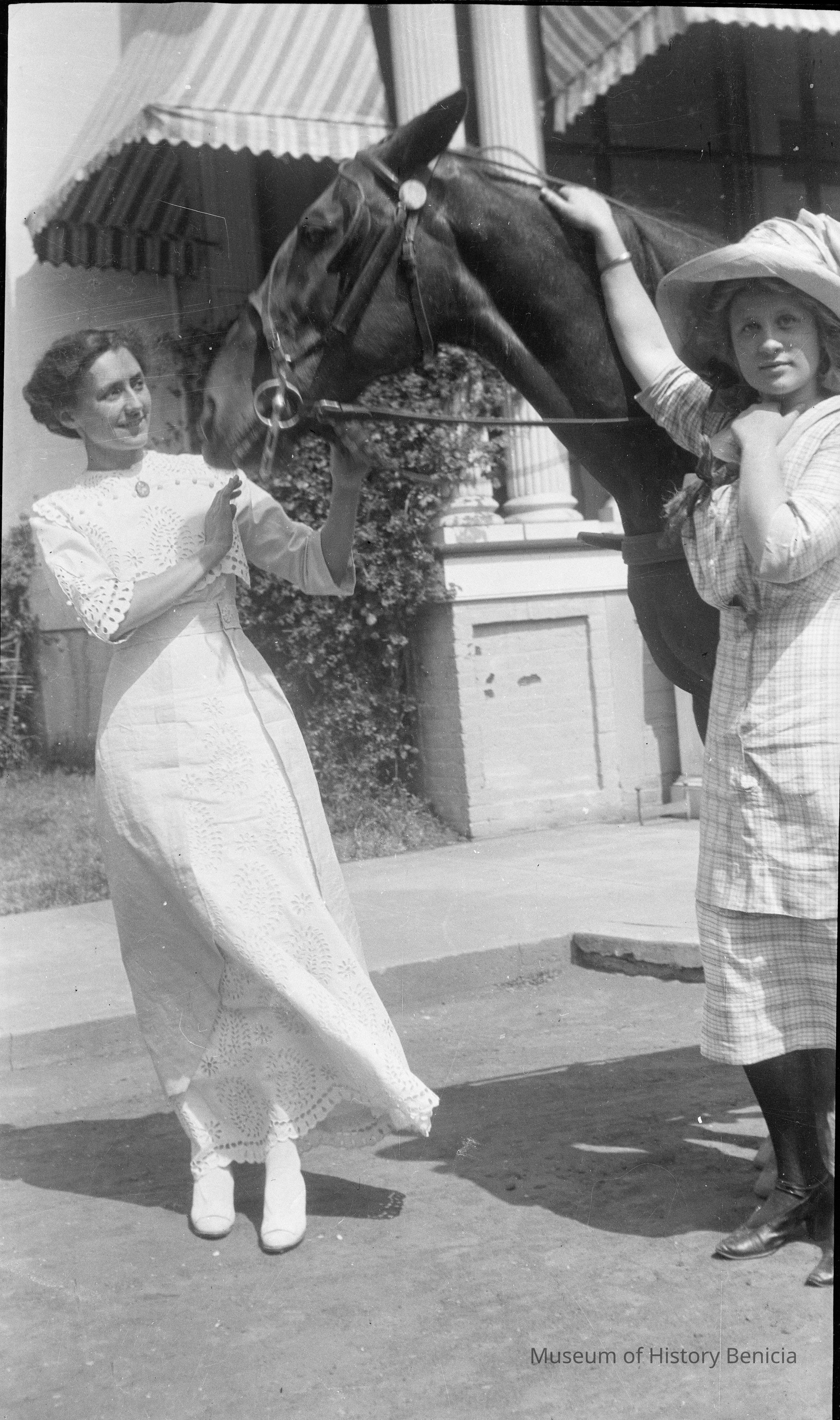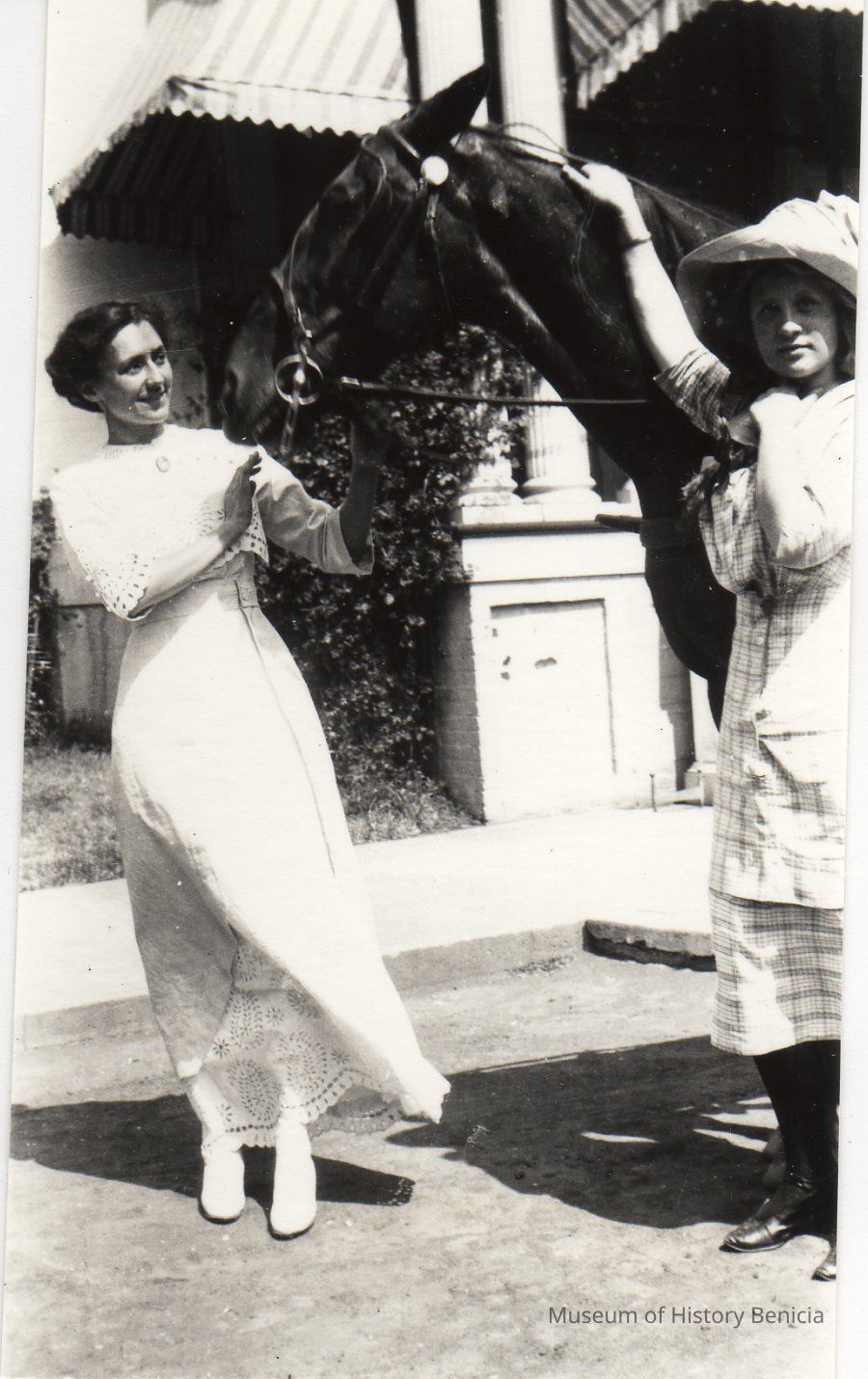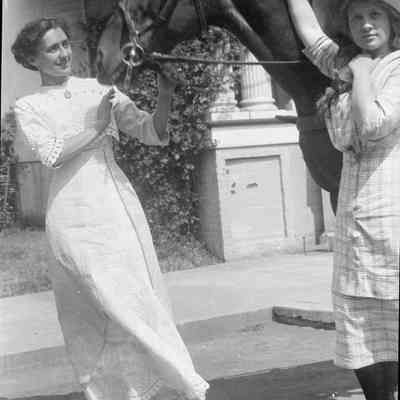 B/W photo of two unidentified women with unidentified horse.