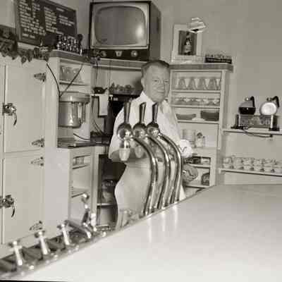 B/W Negative: The man standing behind the counter is either Pete or Jerry Frame. They had an ice cream parlor on First Street between Bento's Shell Gas Station and Park & Shop Market in the 1950's/early 1960's. He is holding a banana split in a glass in his hands. The ice cream sundaes and splits were said by locals to be "yummy!".Collection