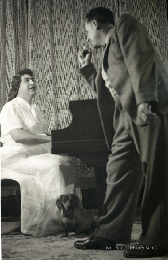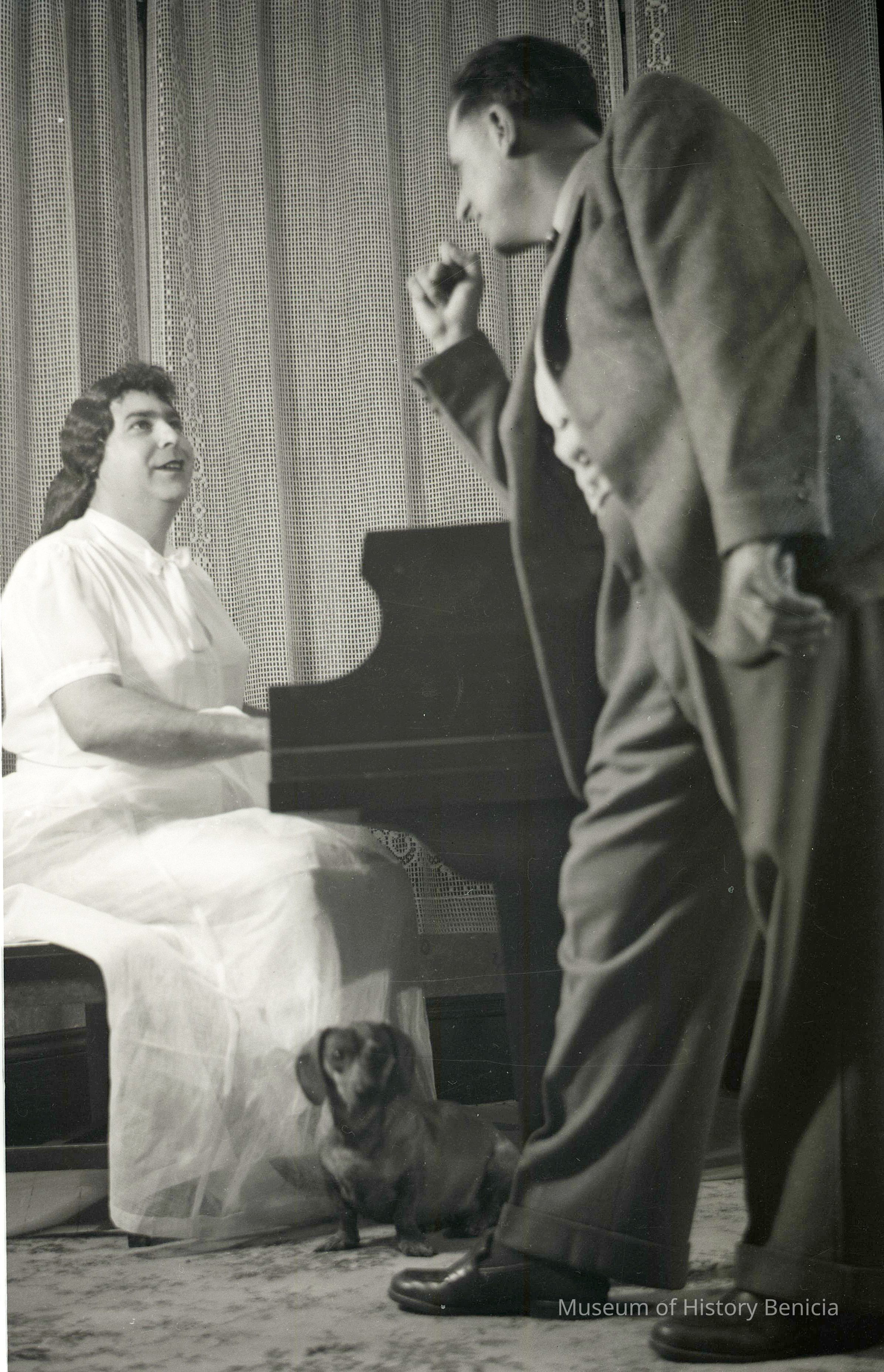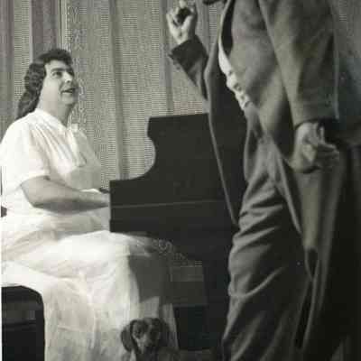 This is negative of a man singing to someone playing the piano. There is also a Dachshund on the floor.