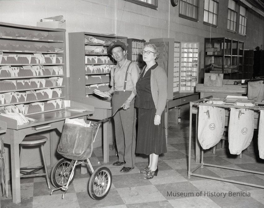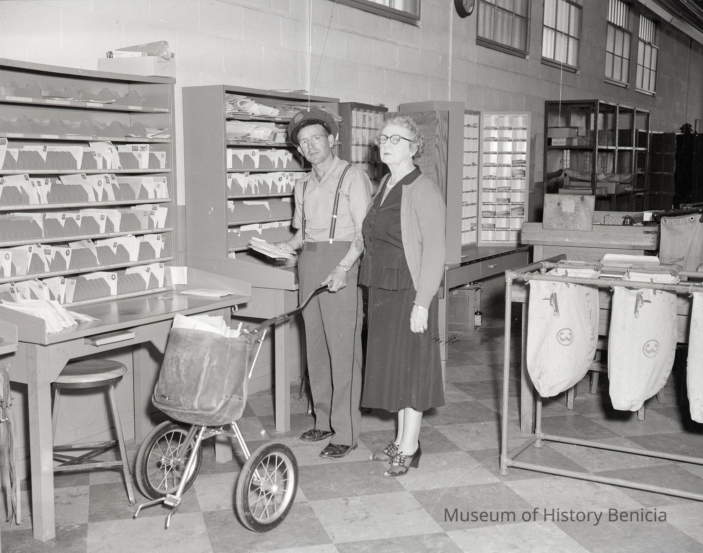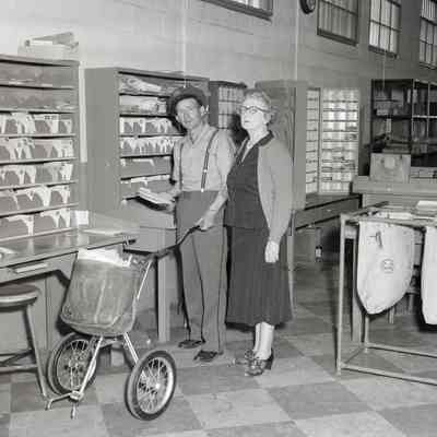 B/W Negative: inside the U.S. Post Office at West K and West 2nd Streets -- Postmistress Alma Pometta is on the left of an unidentified mail carrier with a rolling cart.