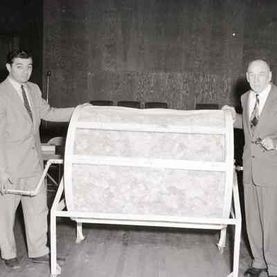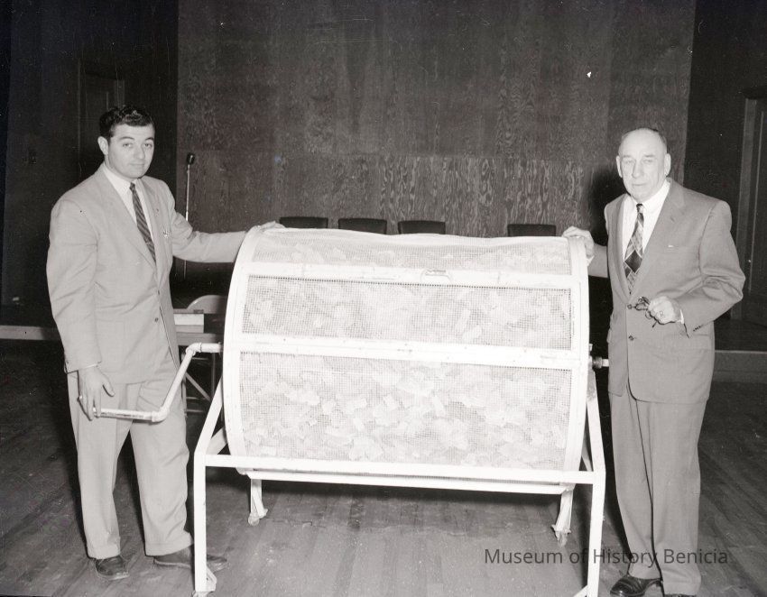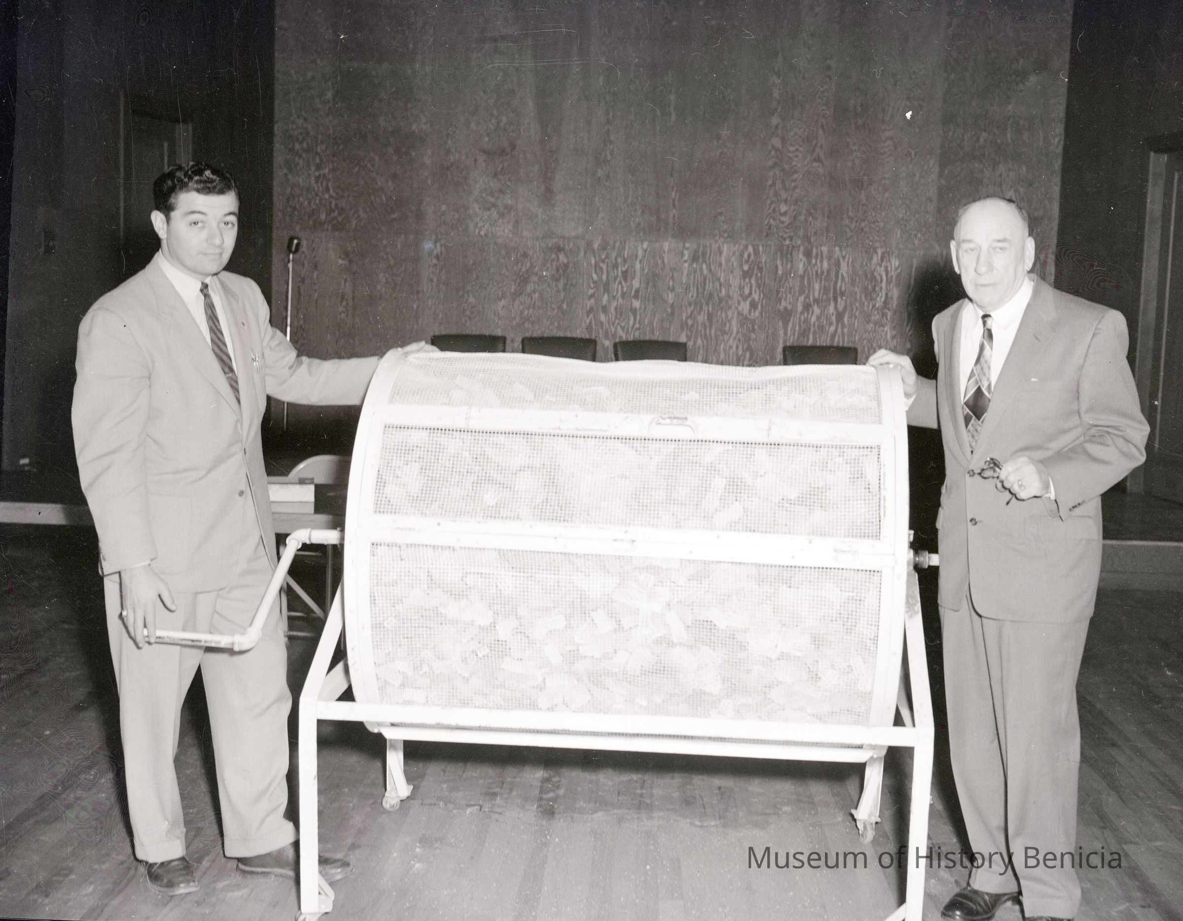 B/W Negative: Lottery Drawing: shows two unidentified men on either side of a large revolving drum holding tickets.