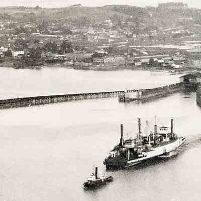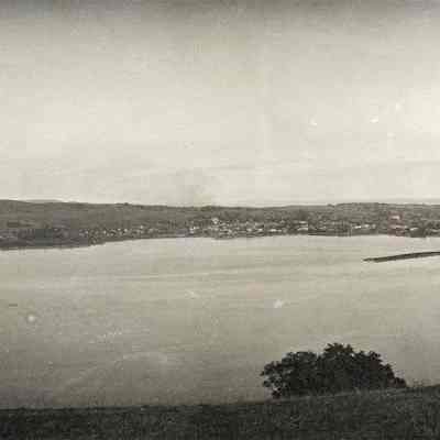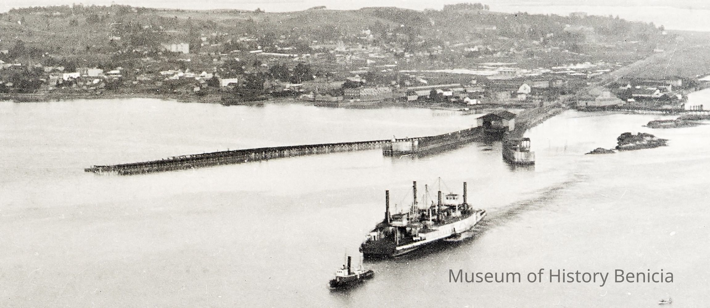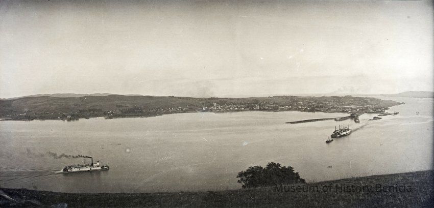 B/W Negative: Carquinez Strait from Crockett side, paddlewheel steamer at left and freighter being towed past Benicia ferry dock at right.