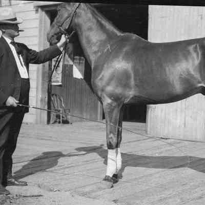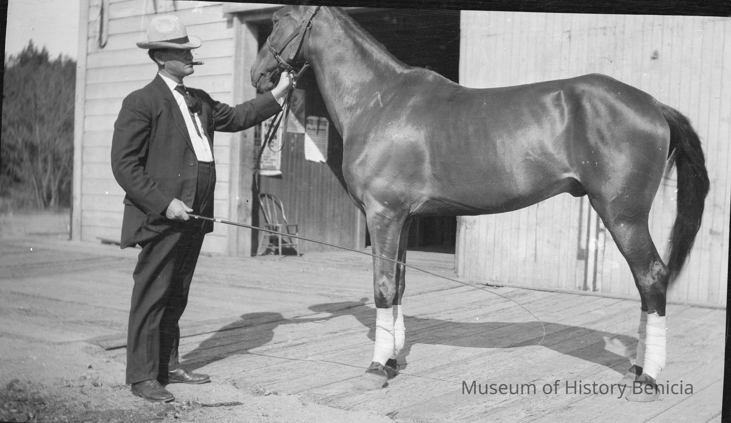 B/W photo of unidentified man posing with unidentified horse at unidentified location. Judging from the wrapping on the horse's legs, this might be a racehorse.Collection