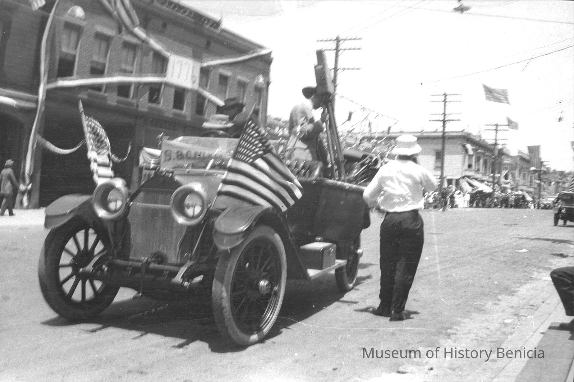 Negative of car in a parade. The man in front has a motion picture movie camera. The siign in the back says S B C Film Co. Could be people filming a Benicia Fourth of July parade.Collection