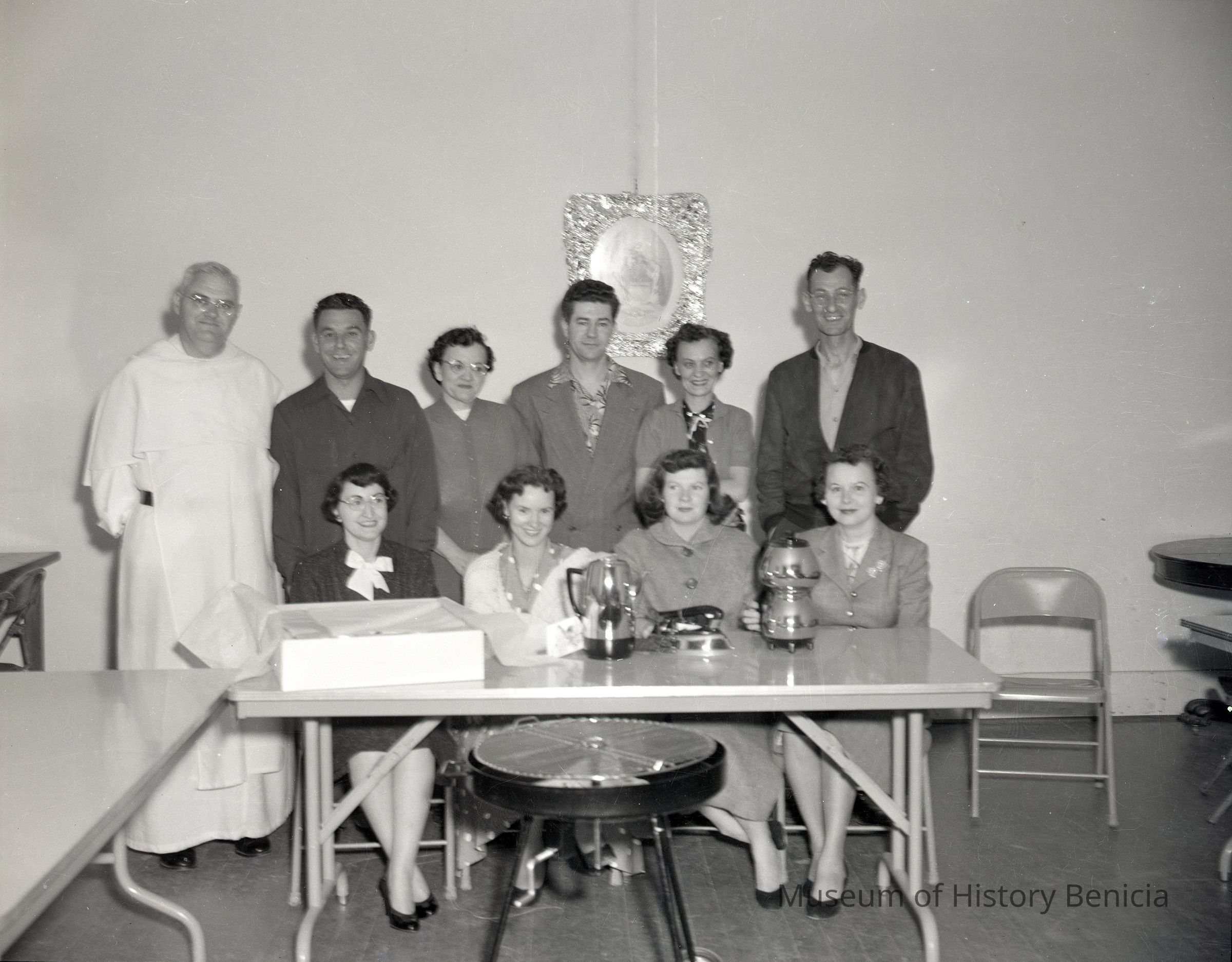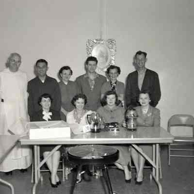 B/W Negative: a group of people 10 people (6 standing/4 seated) behind a table may have something to to with St. Paul's Church