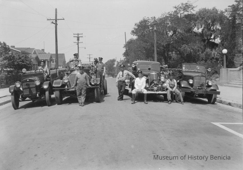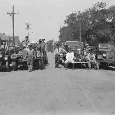Black and white photograph of fire engines lined up on West G Street in front of State Capitol.