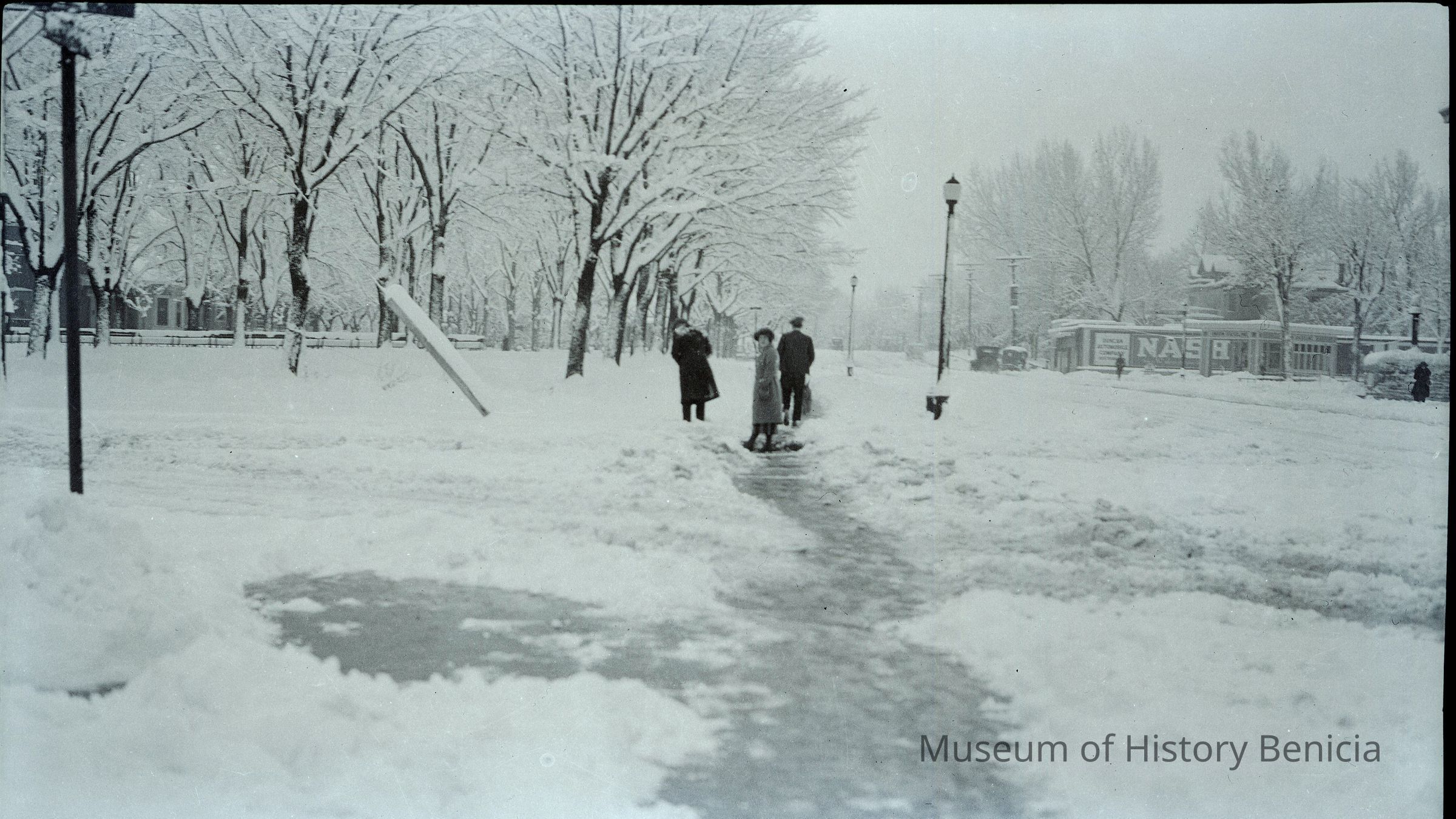 This is a photograph of a three people in snow in front of a building. The sign on the building says "NASH". This could be an old car dealership.Collection
