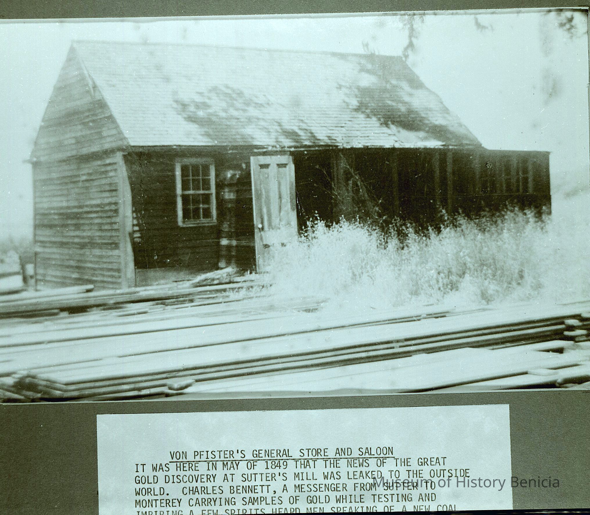This is a negative showing the von Pfister store taken from a display board with a description of the store and its role in the California gold discovery.Collection