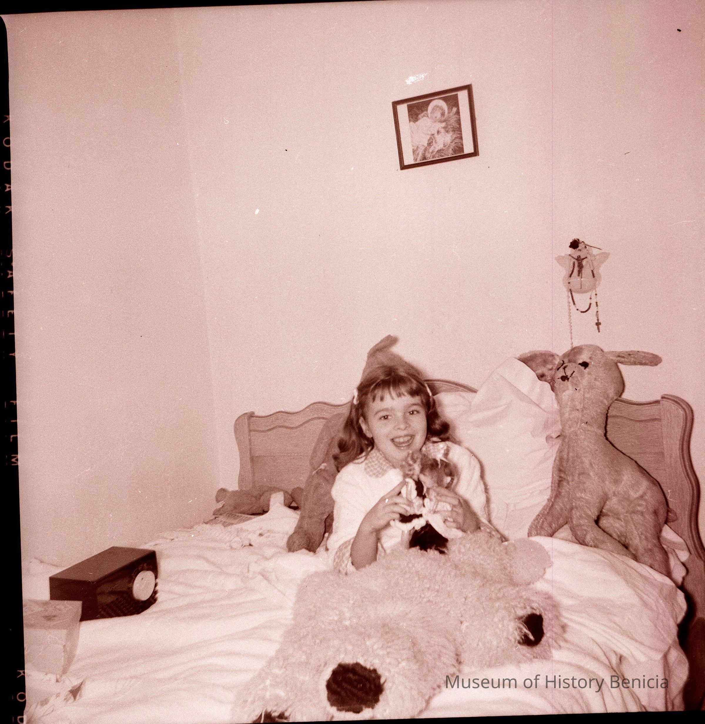This is a photograph of a Patricia O'Grady in her bed. This negative is attached to a similar negative record number 2017.030.0873.Collection