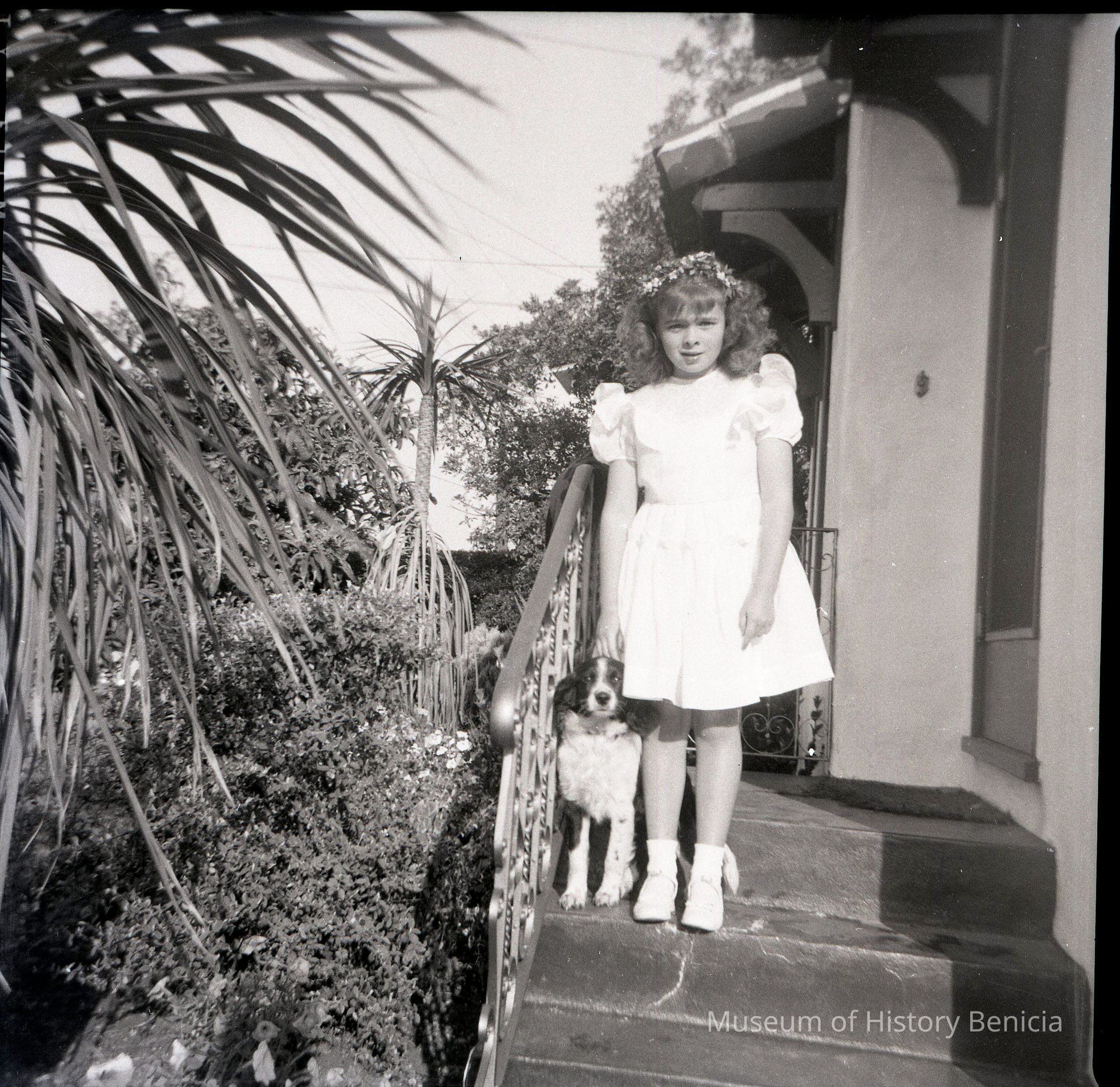 This is a photograph of a Patricia O'Grady with a dog on her front steps.