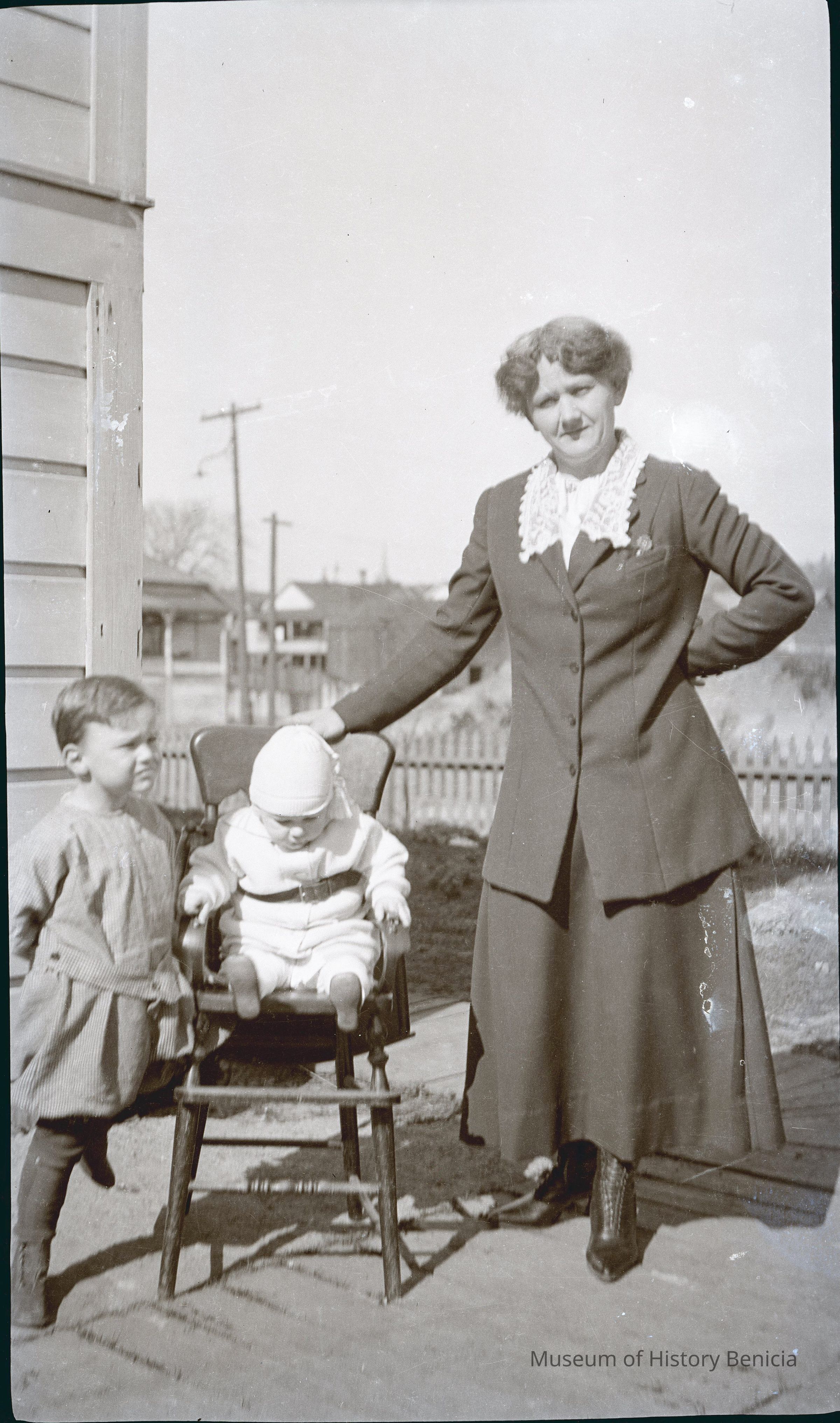 This is a photograph of a woman and two kids on the porch of a house. One child is a boy about 5 years old and the other is a baby in a high chair. There are houses in the background.Collection