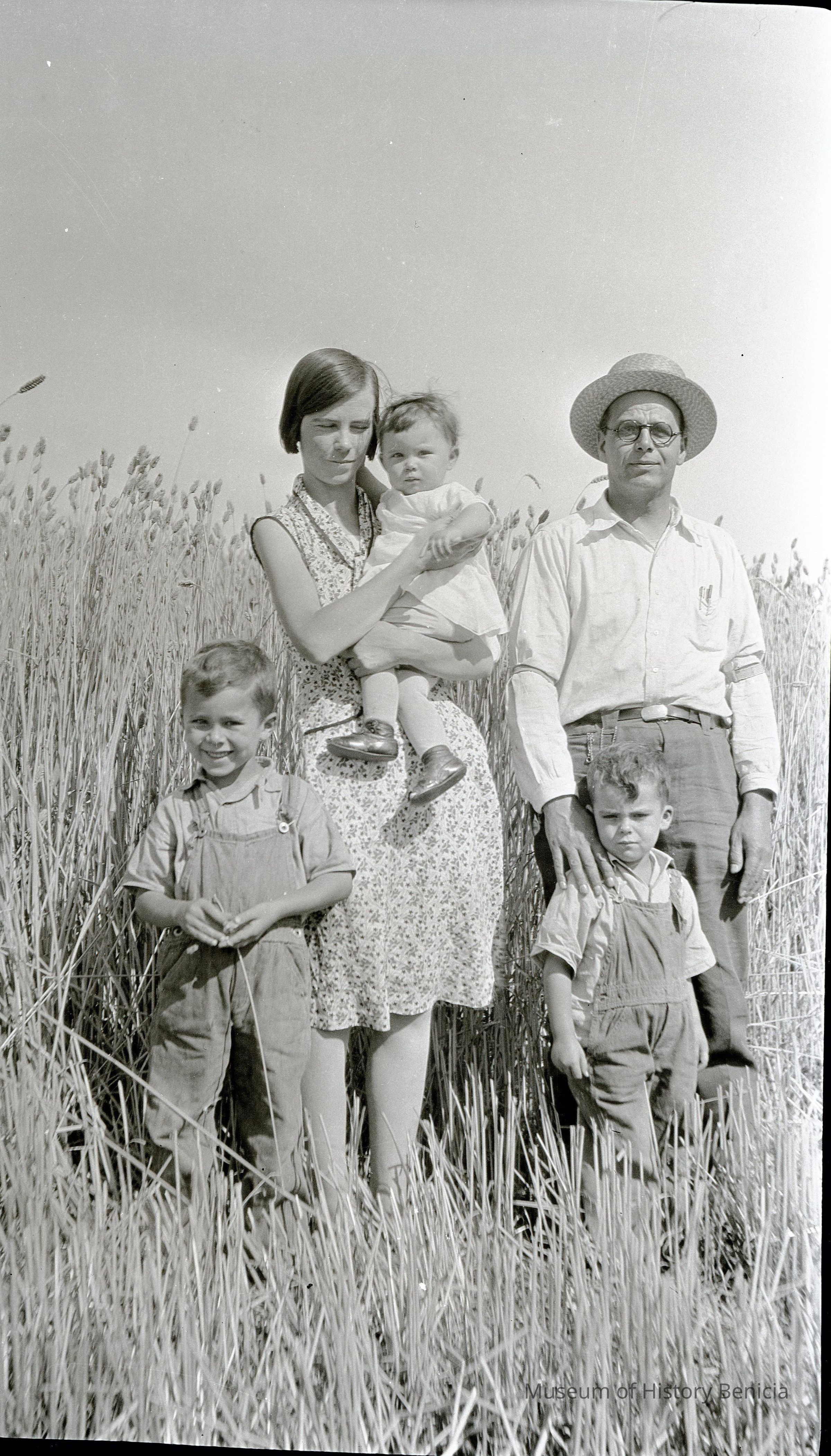 This is a photograph of a family standing in a field. The kids are in overalls and the father is wearing a straw hat and has a pocket watch.Collection
