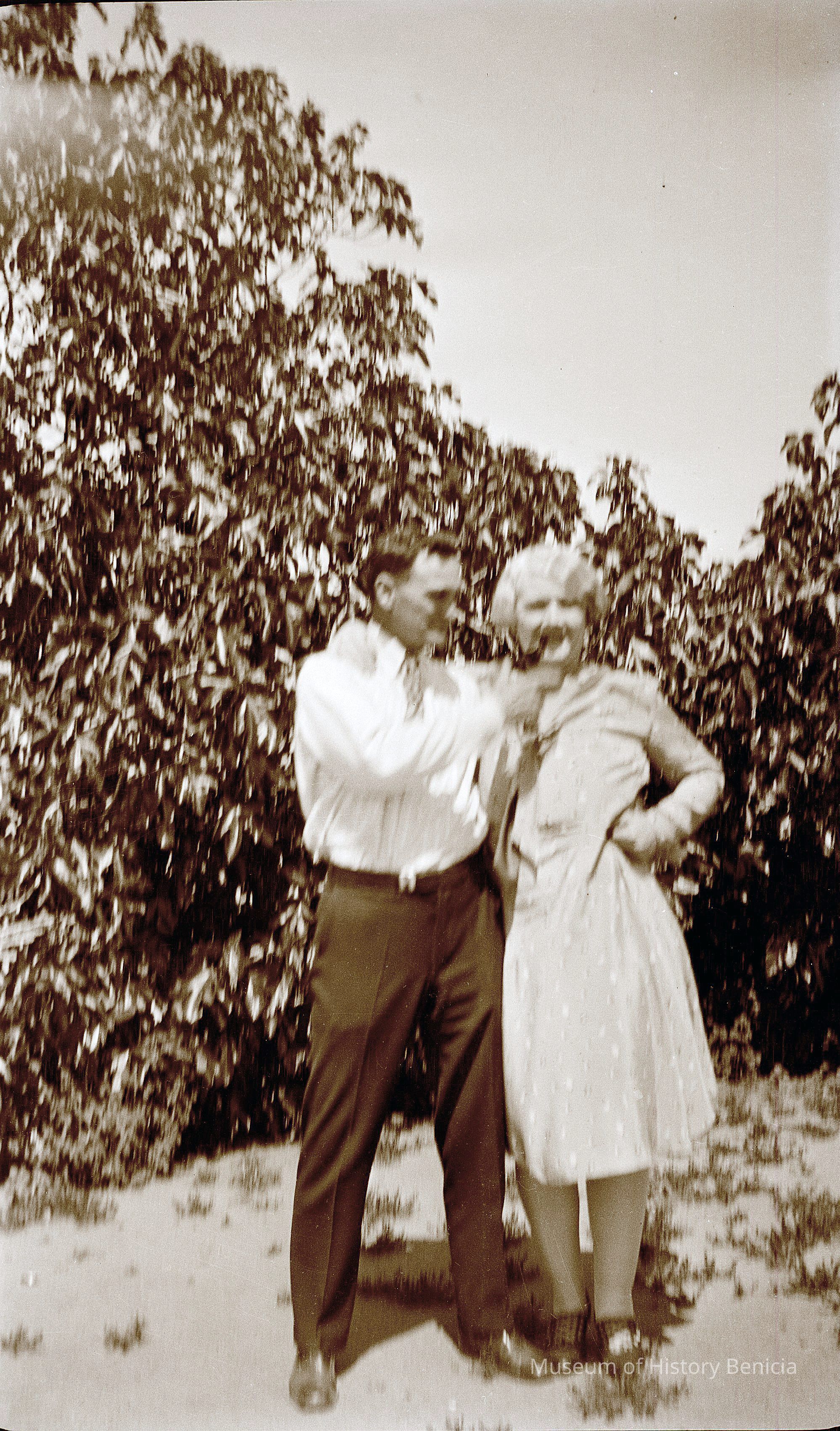 This is a negative showing a couple outside. The woman is attempting to smoke a pipe. The negative is blurry.