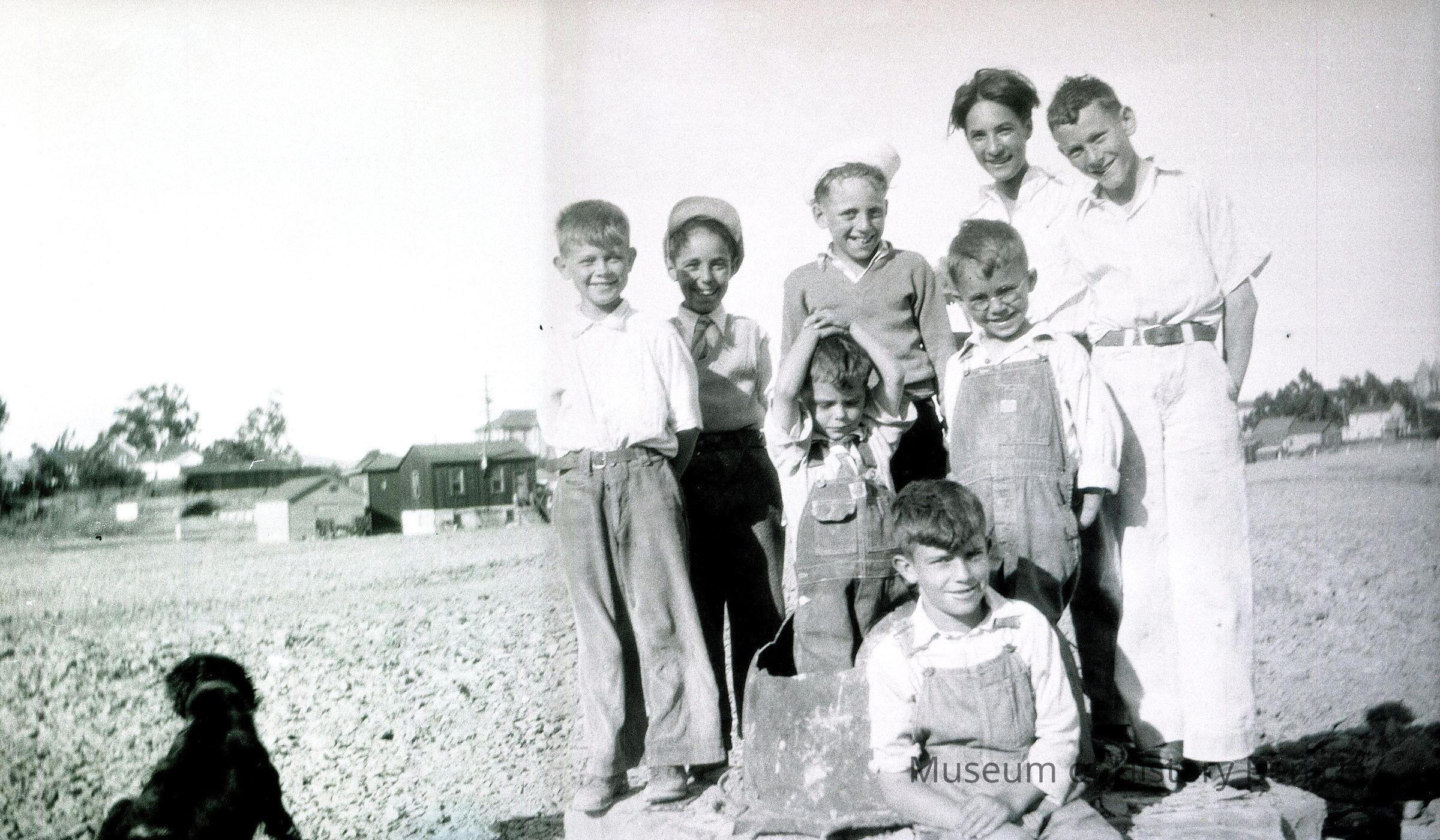 This is a negative showing a group of boys with their dog. One boy is wearing a sailor's cap and two others overalls.