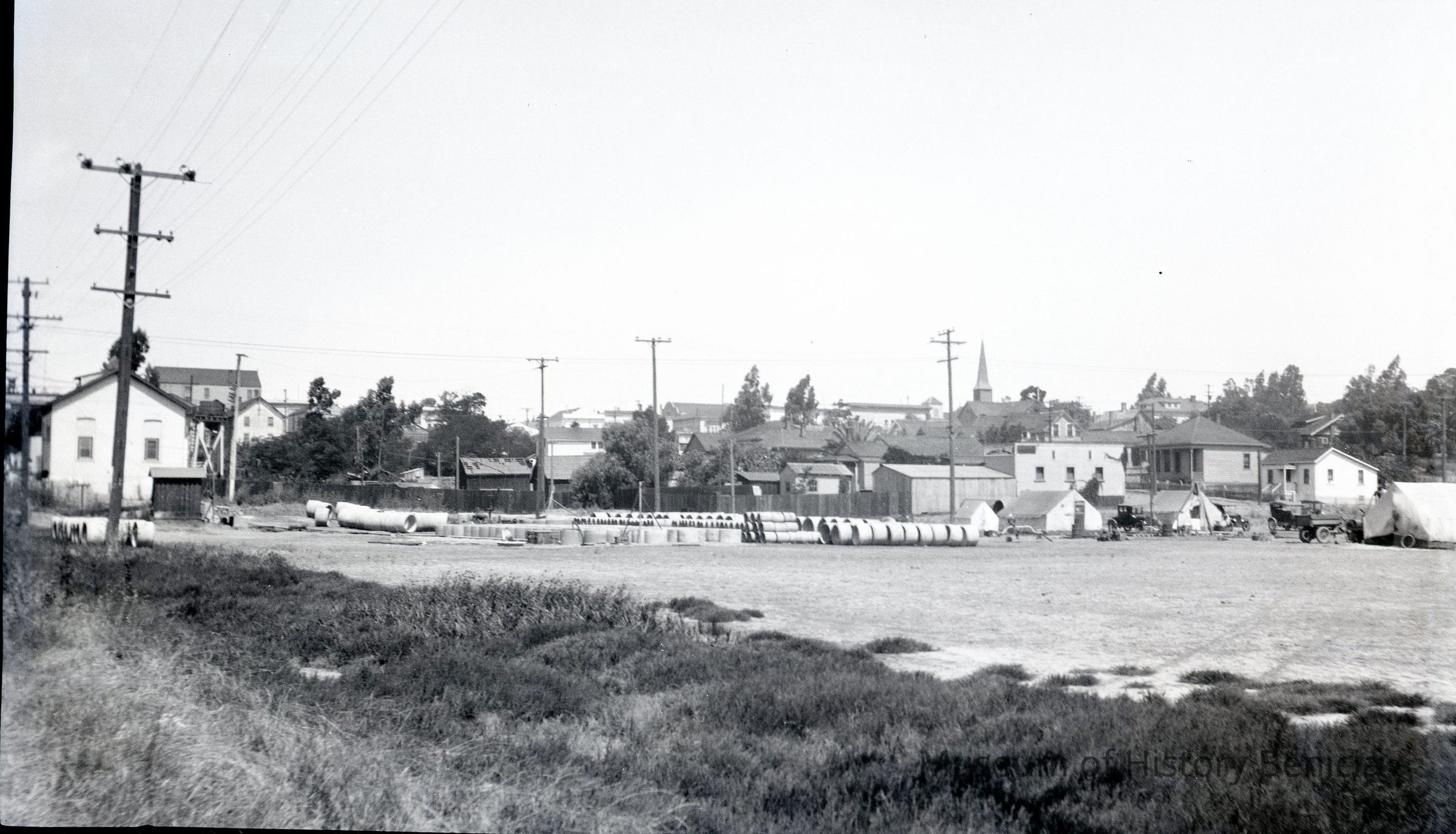 This is a photograph of an empty lot in Benicia. You can see the spire of St. Paul's in the distance. This could be the future site of the Fitzgeral Baseball Field.Collection