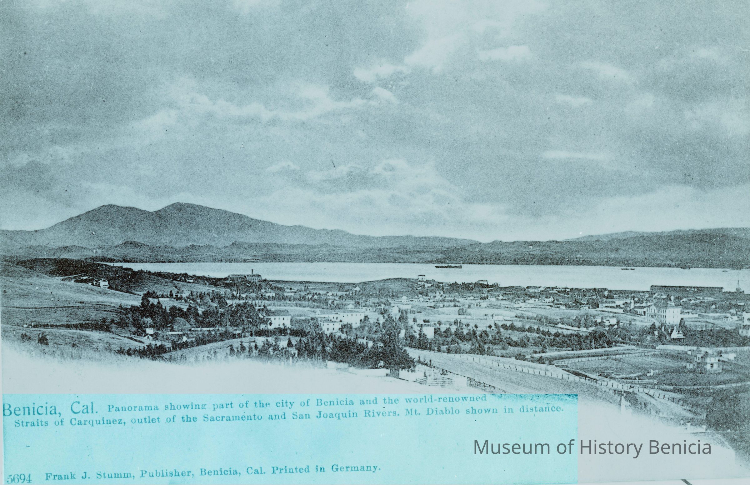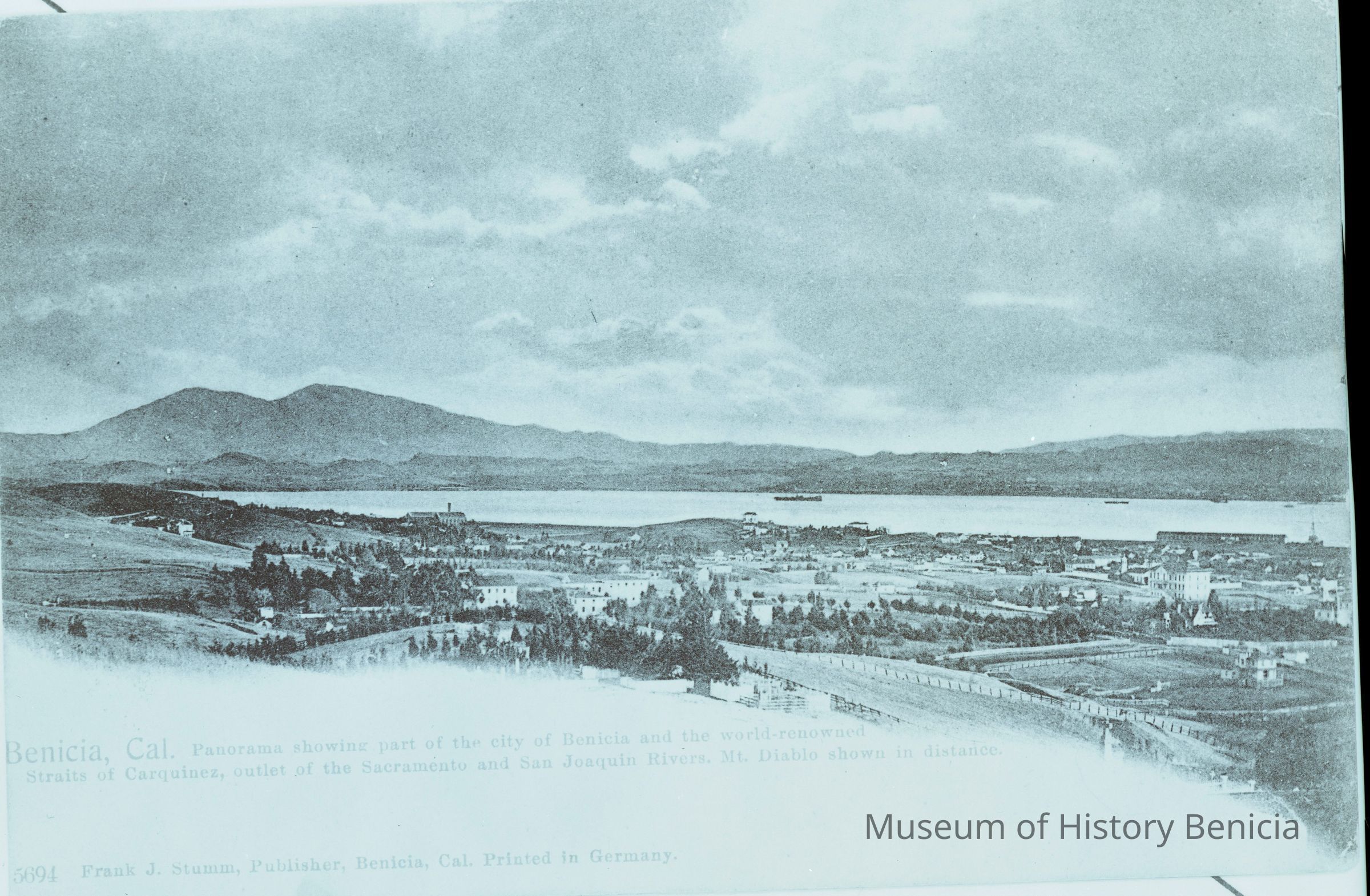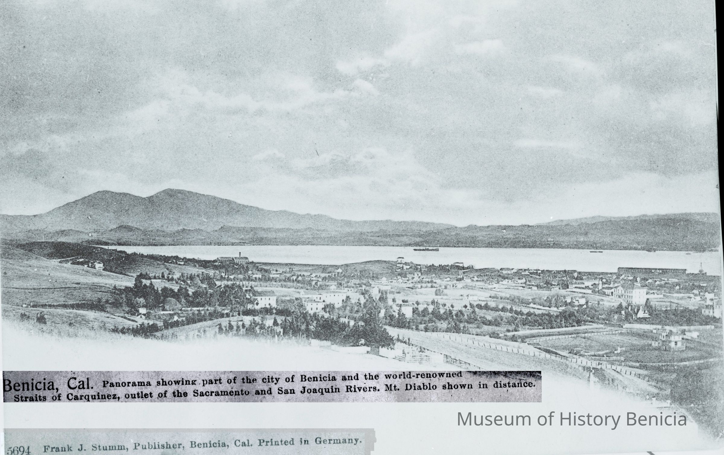 This is a negative copy of a photograph by Frank Stumm and enlarged for printing as a postcard. It shows a panoramic view of Benicia and the Carquinez Straits. It has a description of the scene on the bottom as well as Frank Stumm's name as publisher and is numbered 5694.