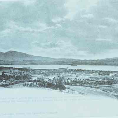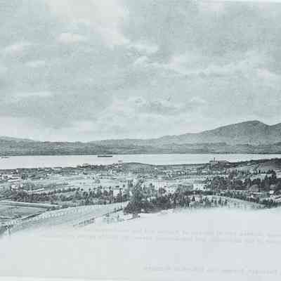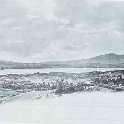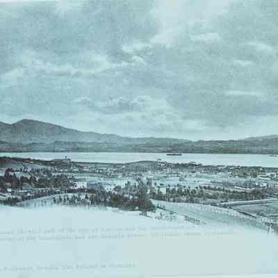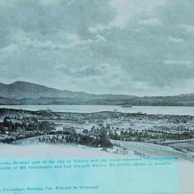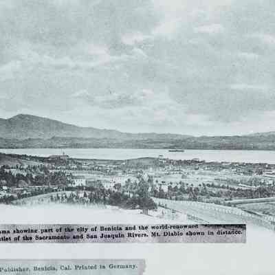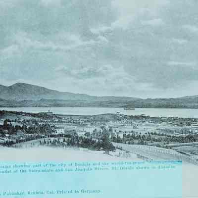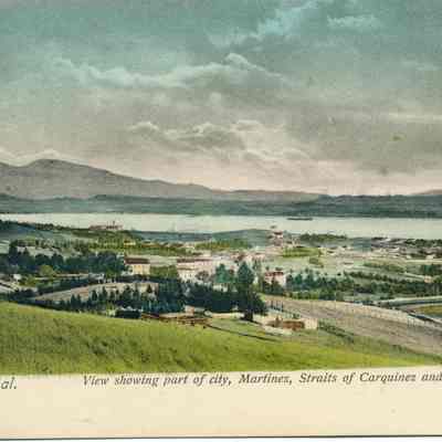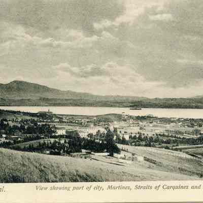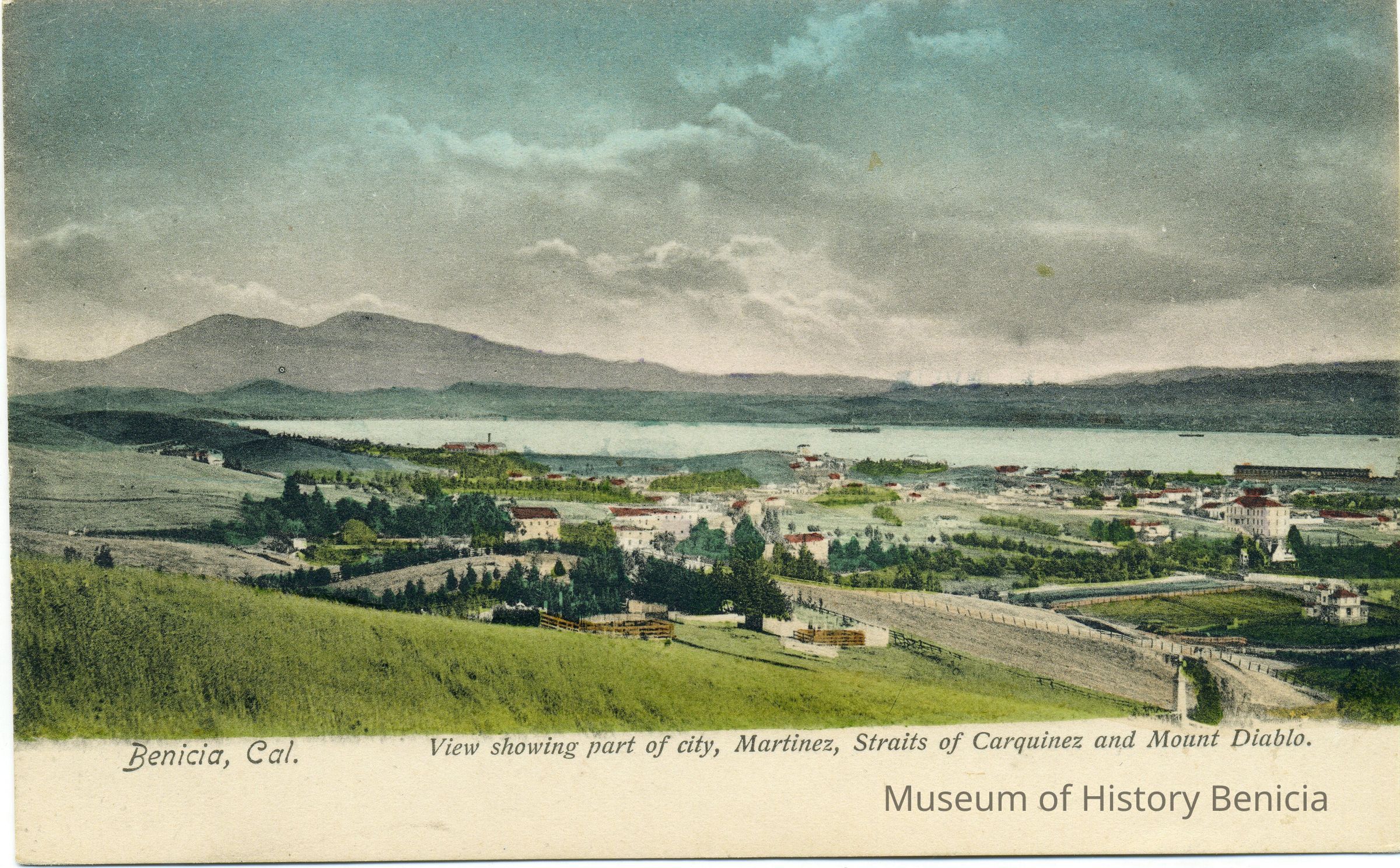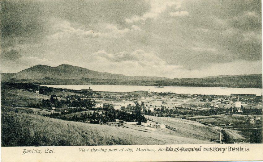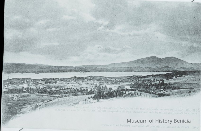 This is a negative copy of a photograph by Frank Stumm and enlarged for printing as a postcard. It shows a panoramic view of Benicia and the Carquinez Straits. It has a description of the scene on the bottom as well as Frank Stumm's name as publisher and is numbered 5694.
