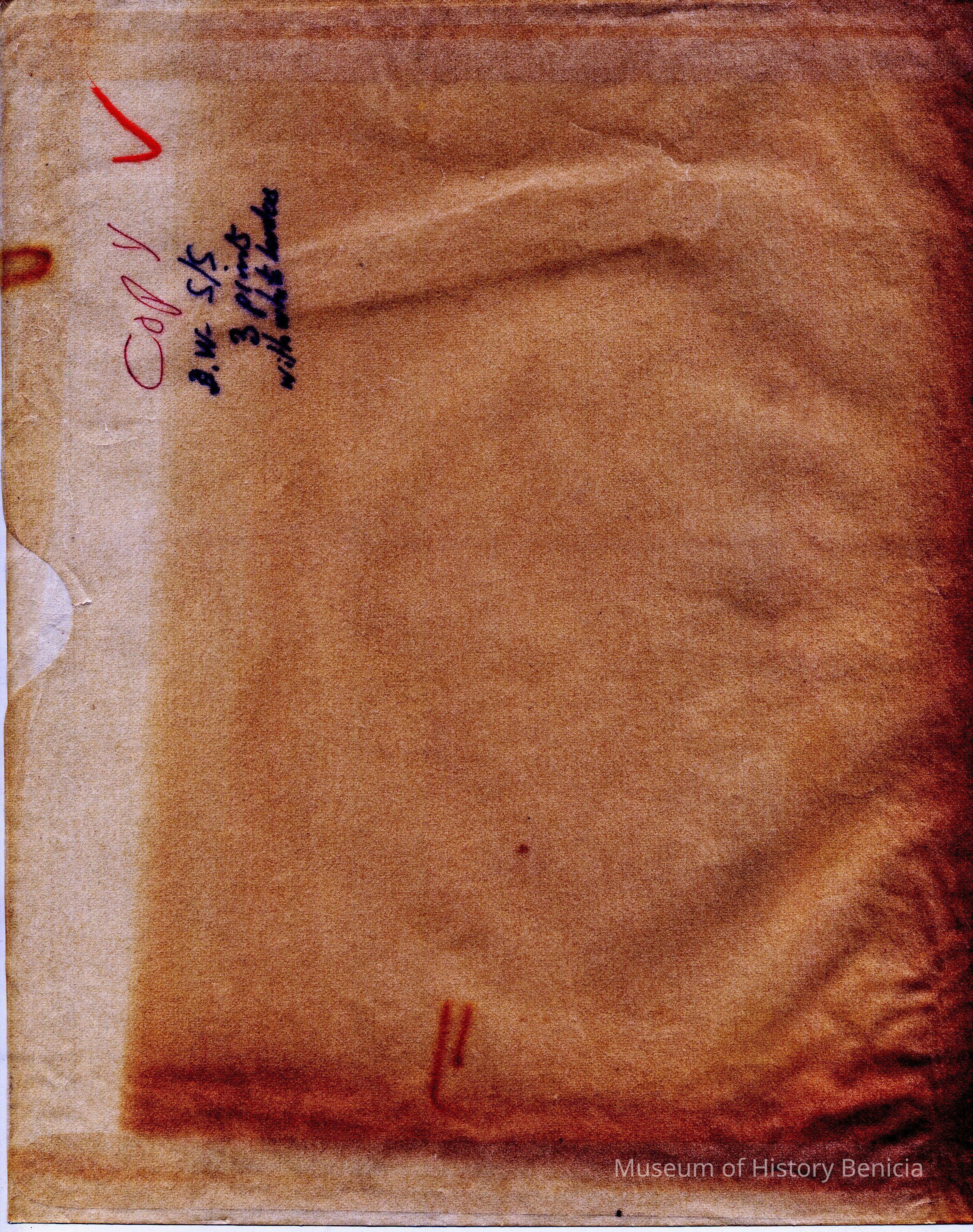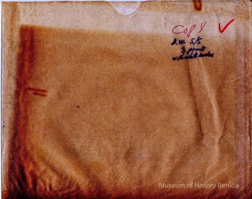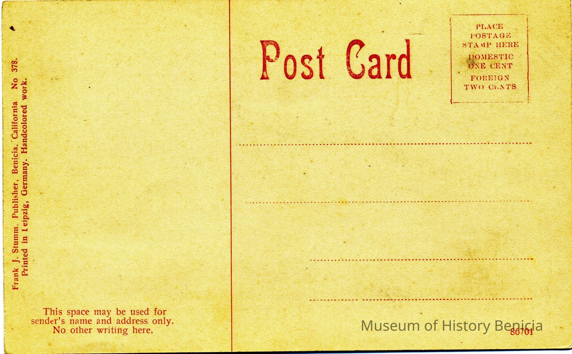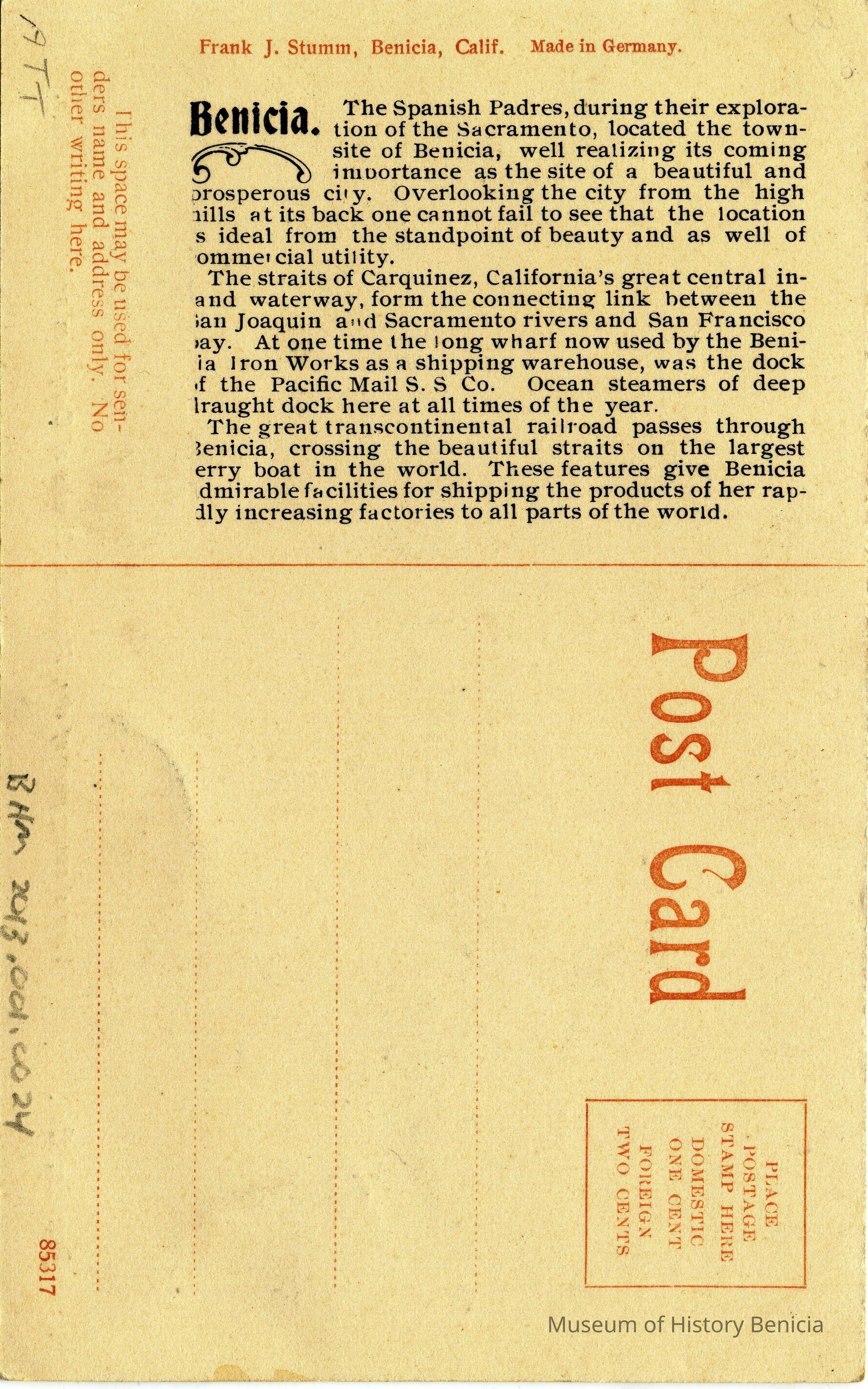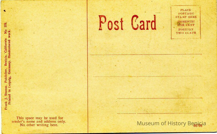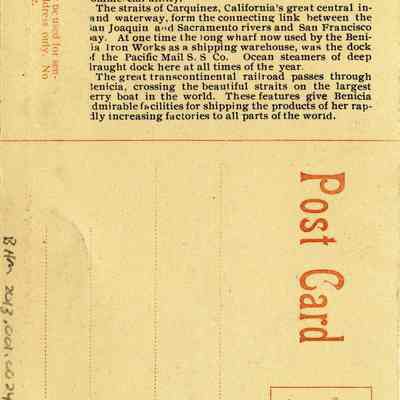We have found two postcards that contain the scene shown in this negative. One is in color and the other in black & white. They don't have the number 5694 and have different descriptions on the front. One also has a paragraph description of Benicia on the back.Collection