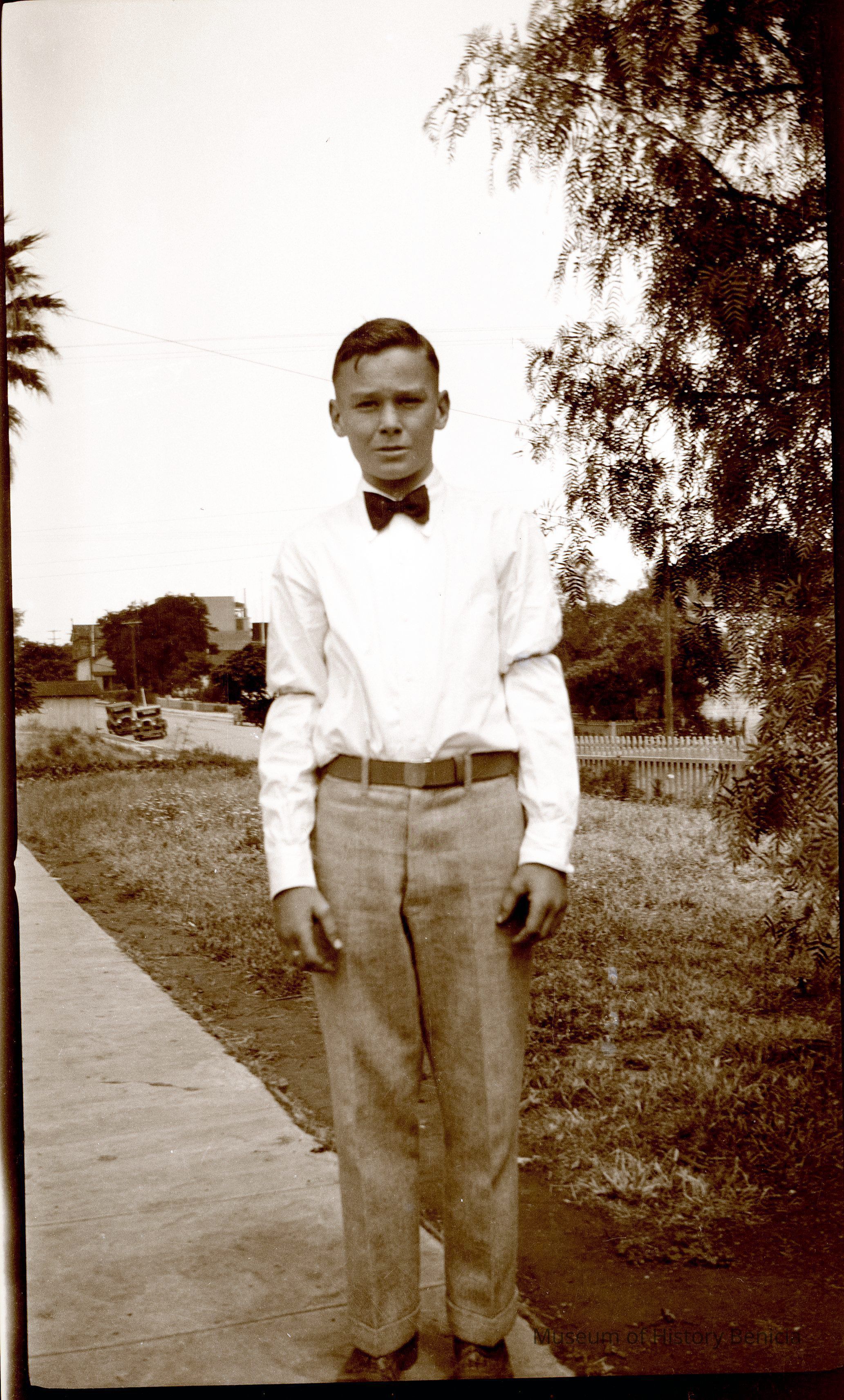 This is a photograph of a boy standing on a sidewalk and he is wearing arm bands to hold up his sleeves.