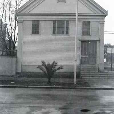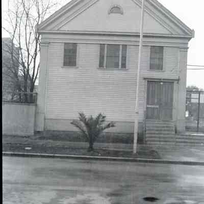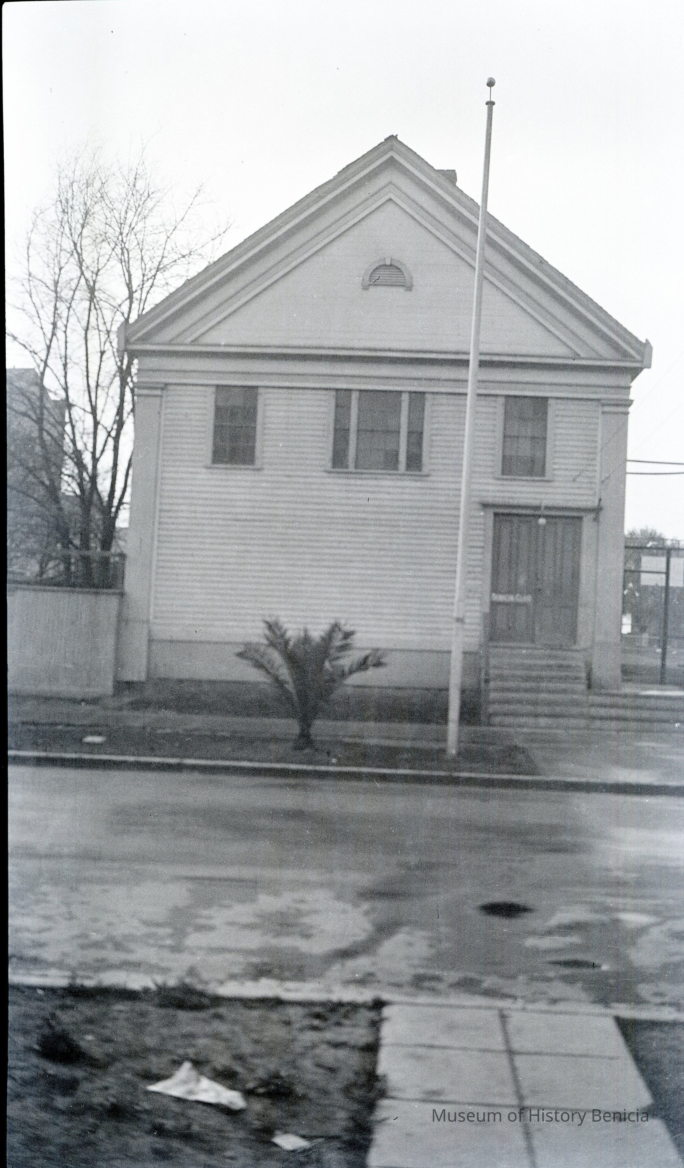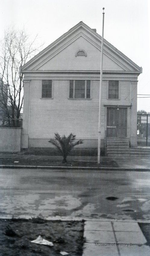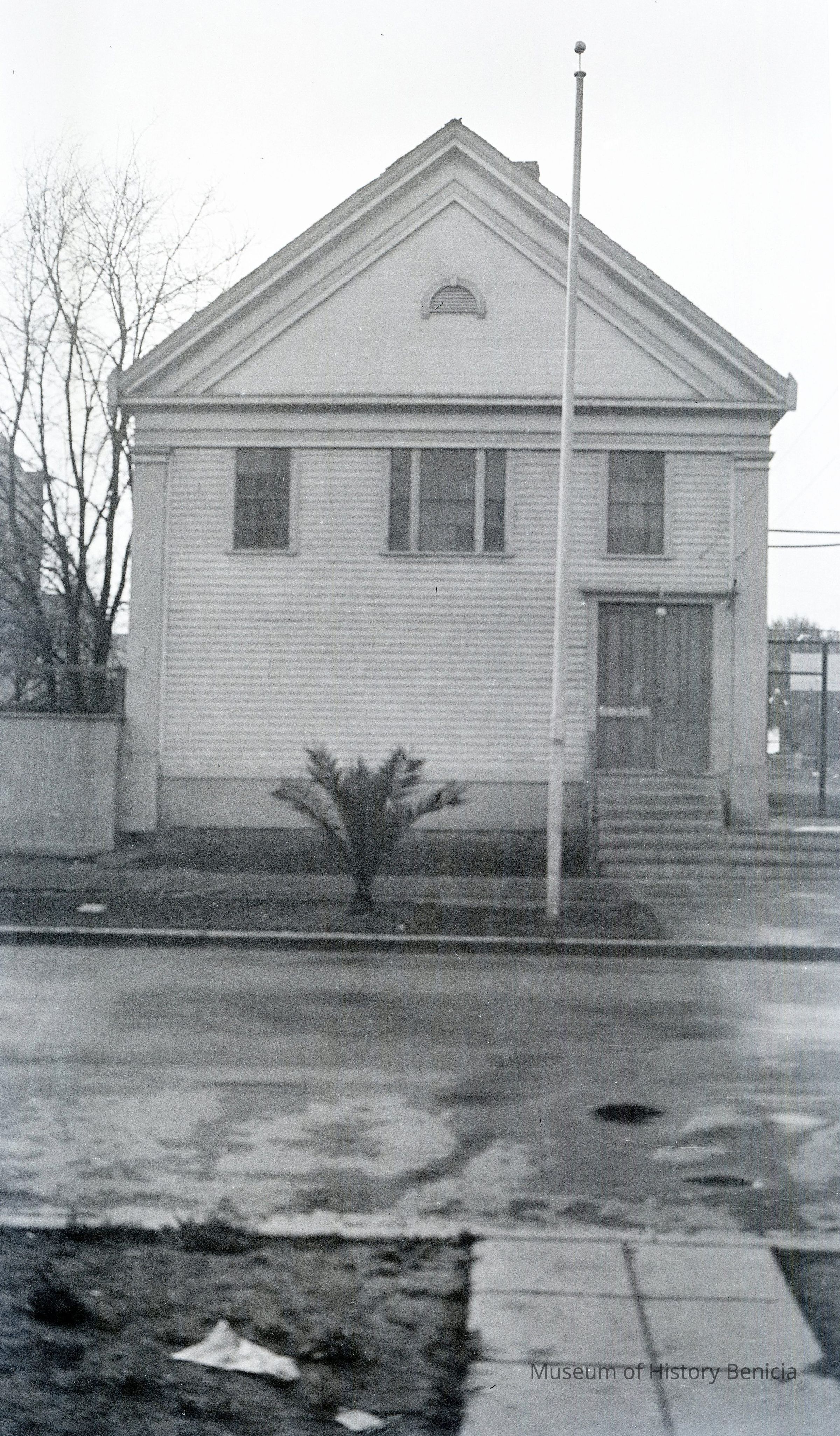 This negative is of the Benicia City Masonic Hall. It shows the building when the palm trees in front were very small..Collection