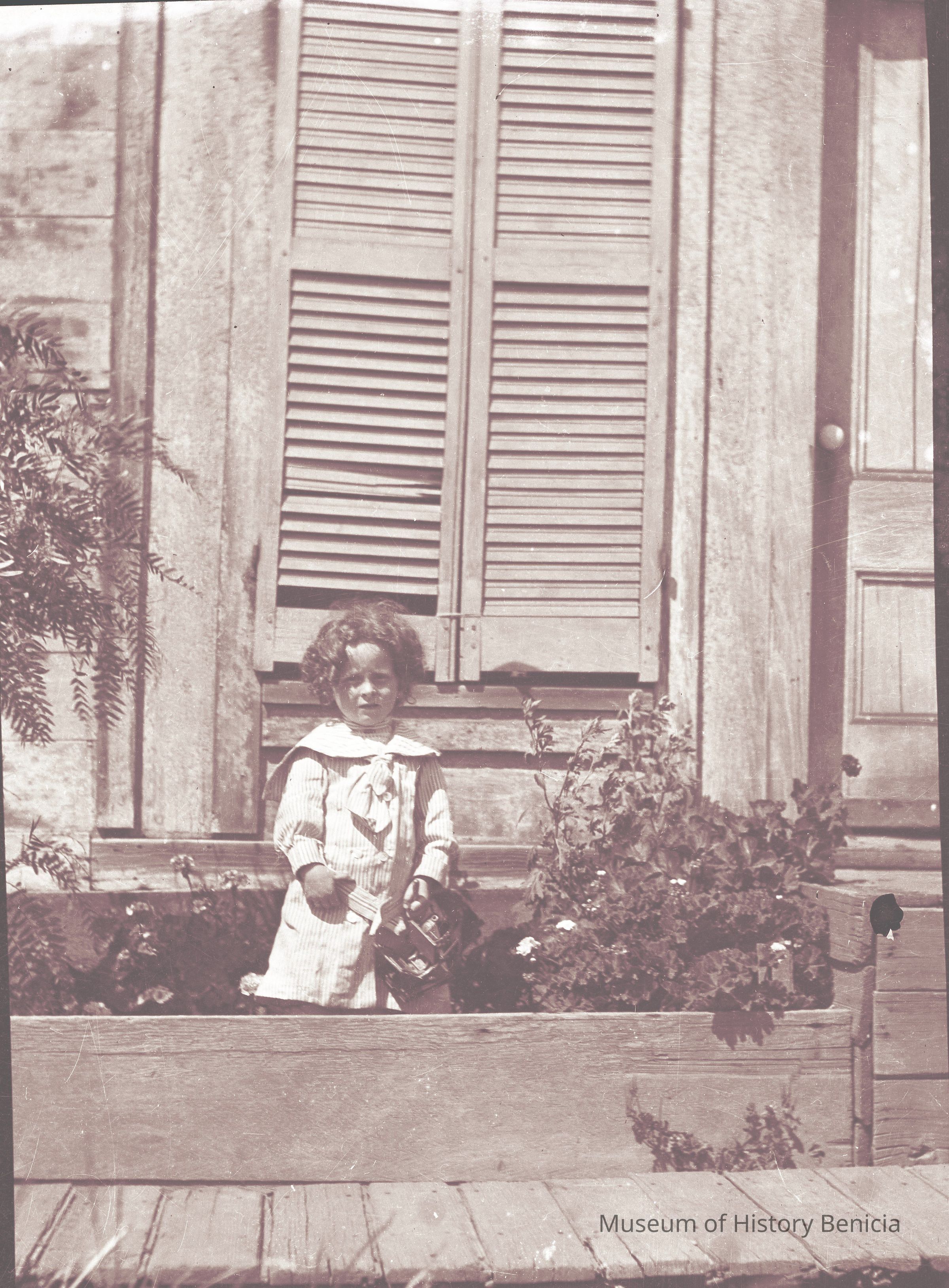 This is a photo of a little girl with a toy in front of shutters. She is the same girl as in 2017.030.1245.