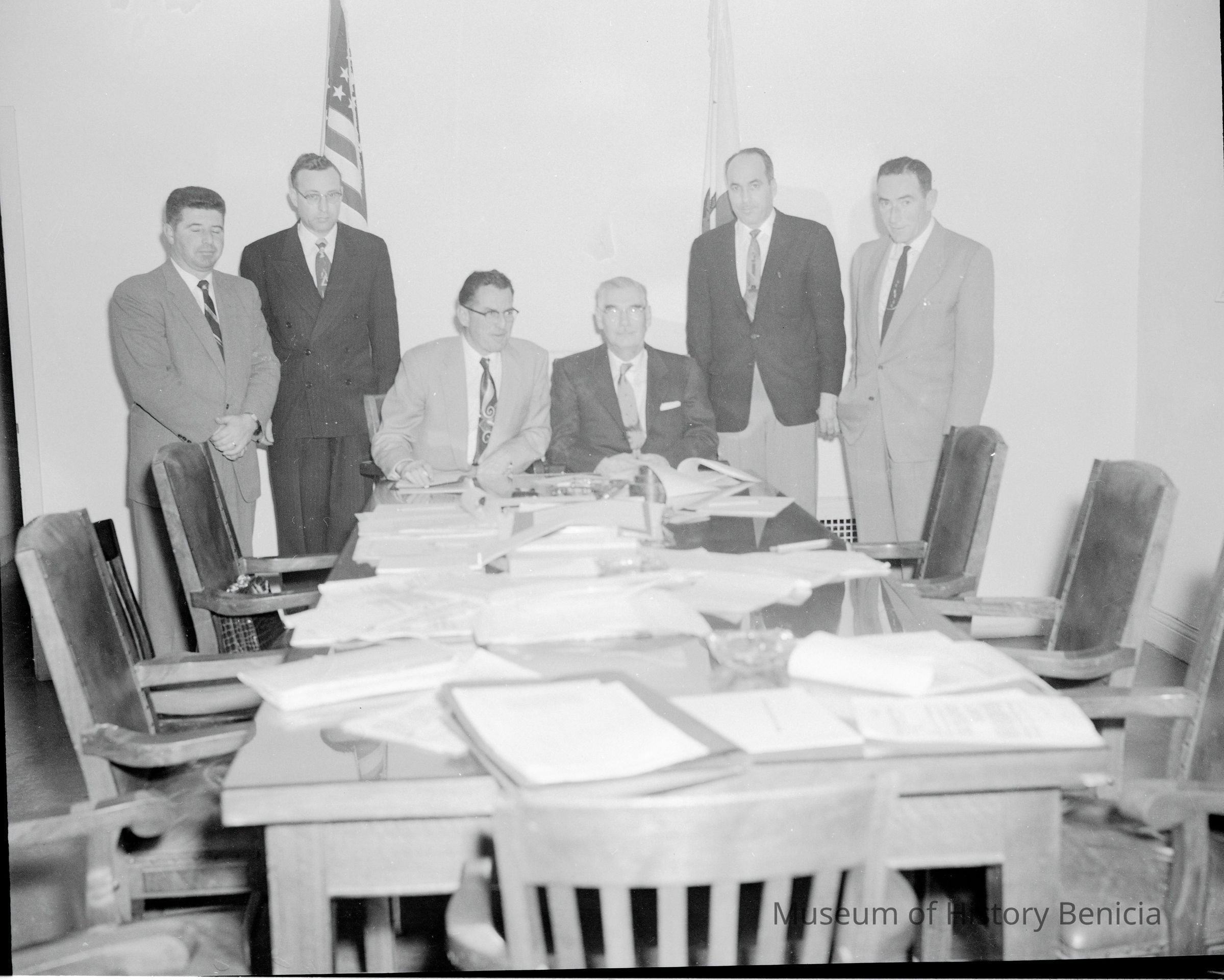 This is a photo of a six men in front of table covered in papers.