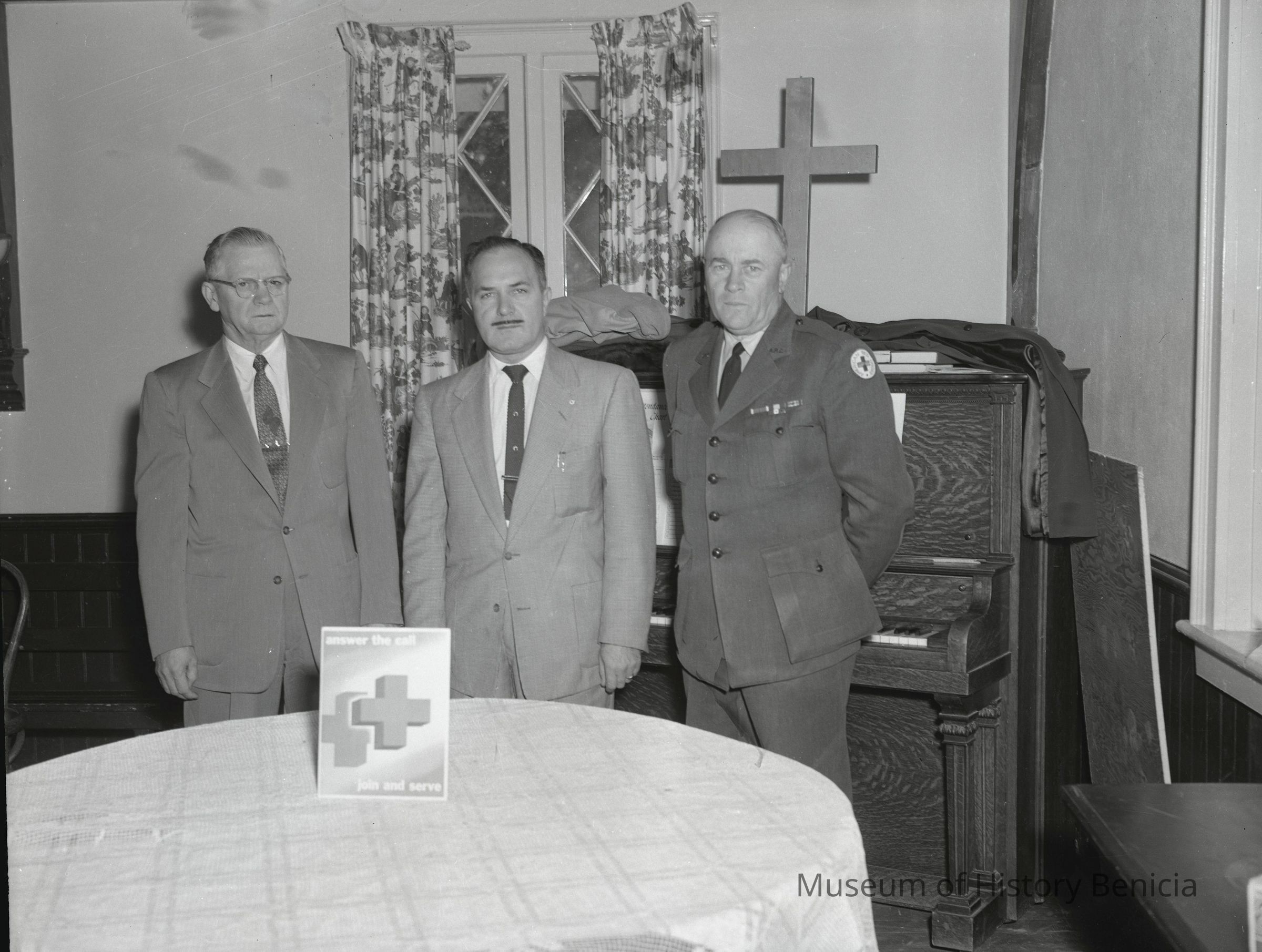 This is a photo of three men in a church behind a Red Cross sign. One man has a shoulder patch for the Red Cross.