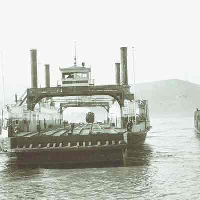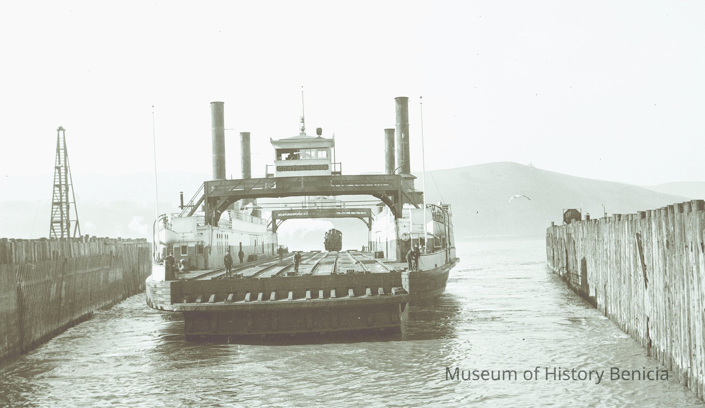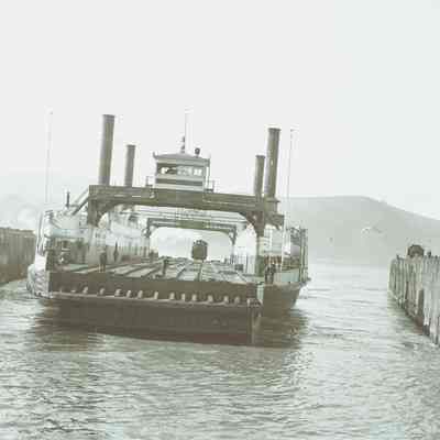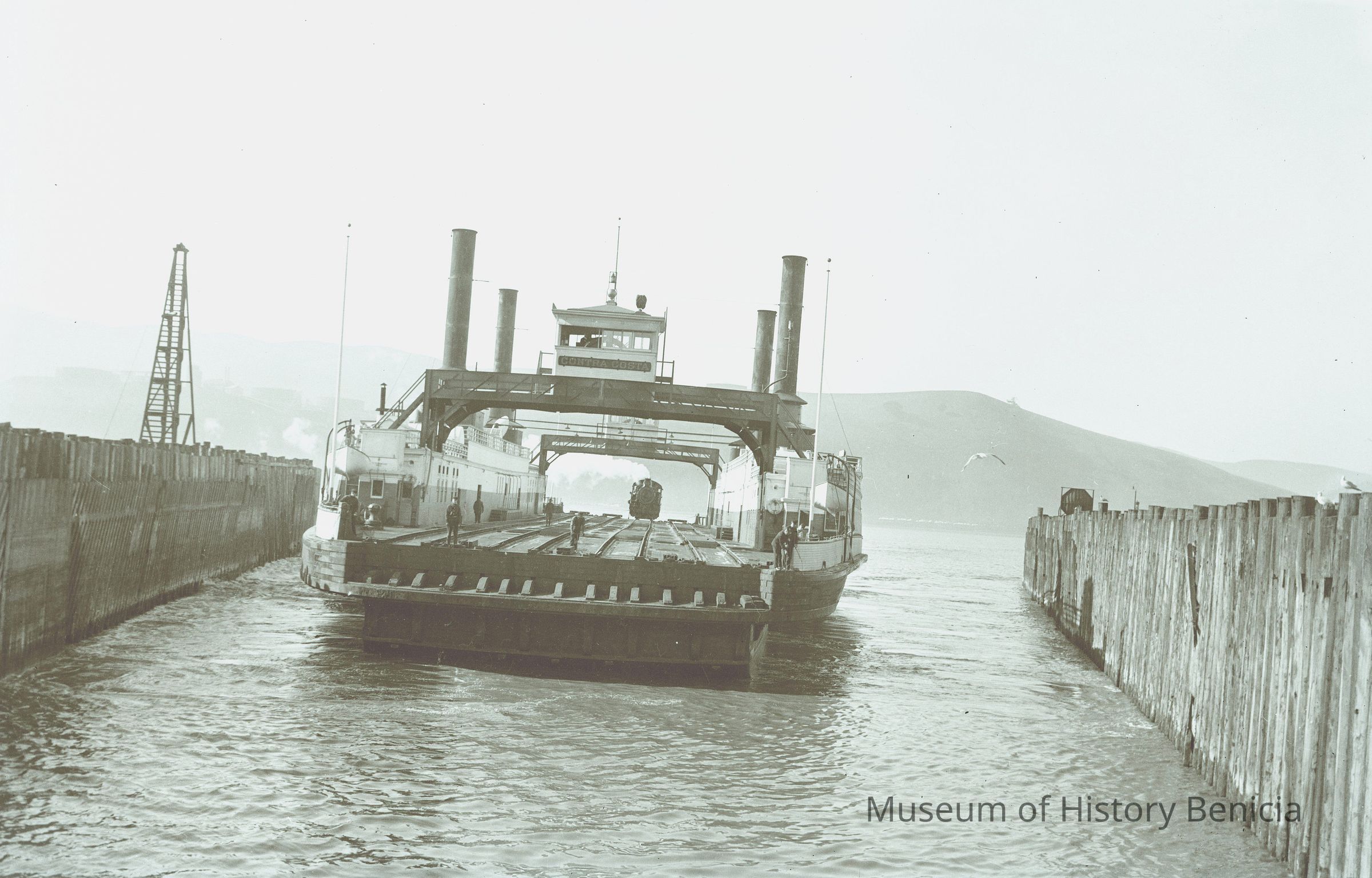 This negative is of the ferry Contra Costa with a train engine loaded on board. There is steam coming from ther locomotive.Collection