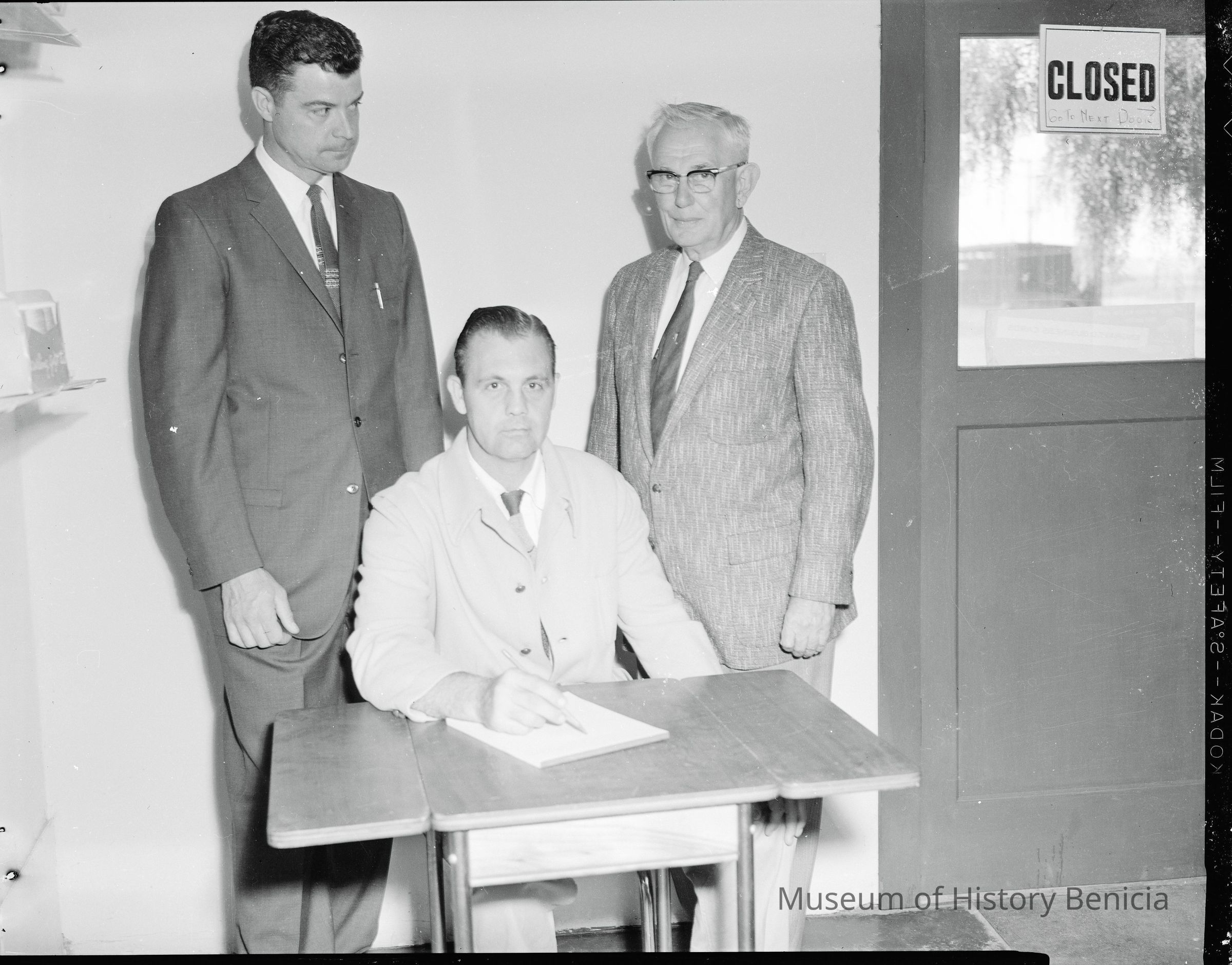 This is a photo of three men in suits. One is sitting at a small table. They seem to be in an office.