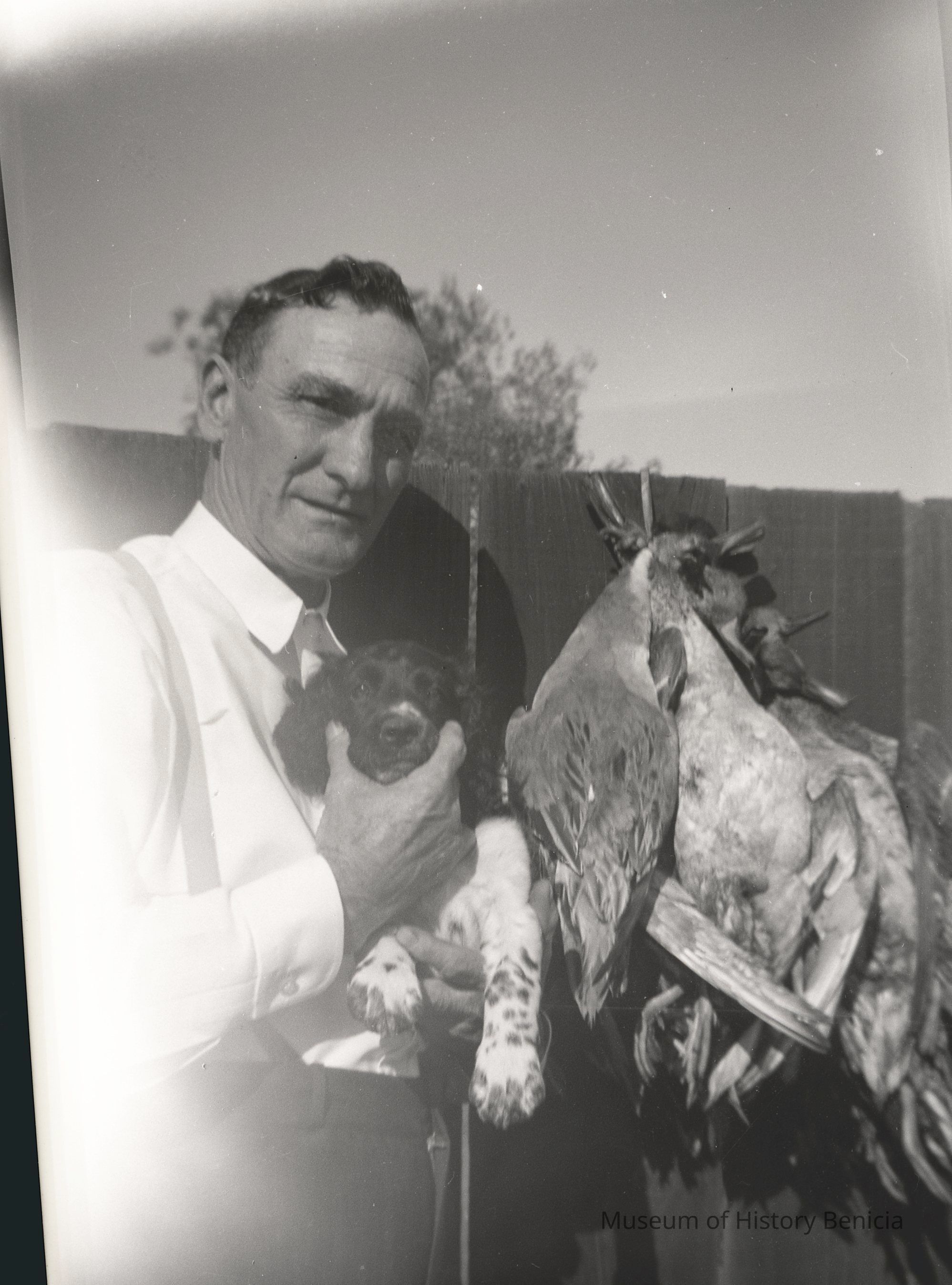 This is a photo of a Wassmann family member holding a dog and several dead ducks hanging next to him. He may be training the dog for duck hunting.Collection