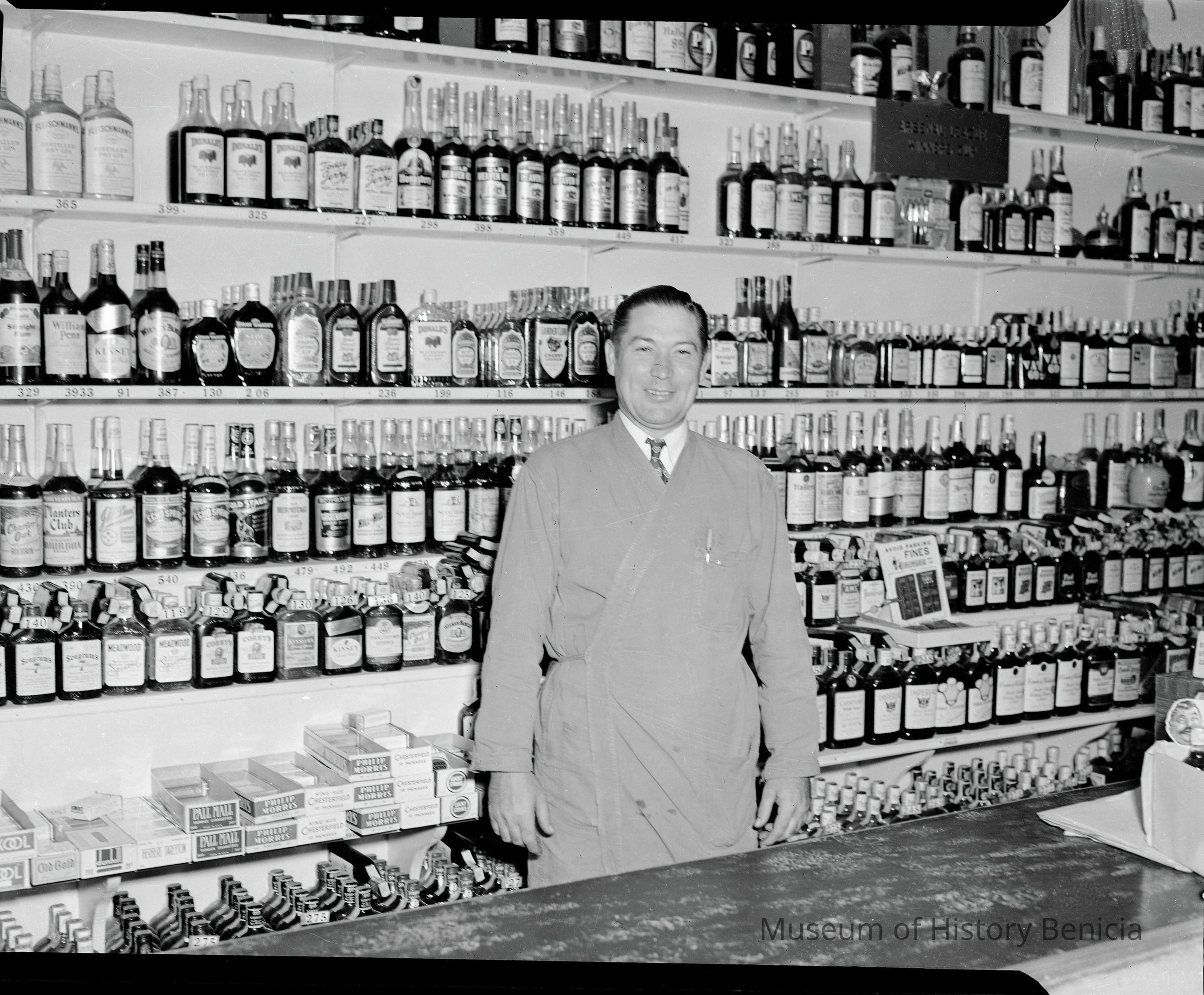 This is a photo of a man in a liquor store behind the counter. The man in the photograph is Jack Waterson. He was from Oklahoma or somewhere in the midwest. He bought the Black & White Liquors on the corner of First and I Sts. from Thomas Wright in 1942. Thomas Wright owned two stores called the Black and White. One was next to the old State Theater and the other at First and I Sts. Jack Waterson consolidated the stores at a single location, First and Sts. Jack Waterson died in July 1959 at the age of only 47 and his son-in-law, Jerry Wells, took over the business. Shortly after that the Nickolatas brothers bought the business. (They also owned a liquor store in Vallejo.)
